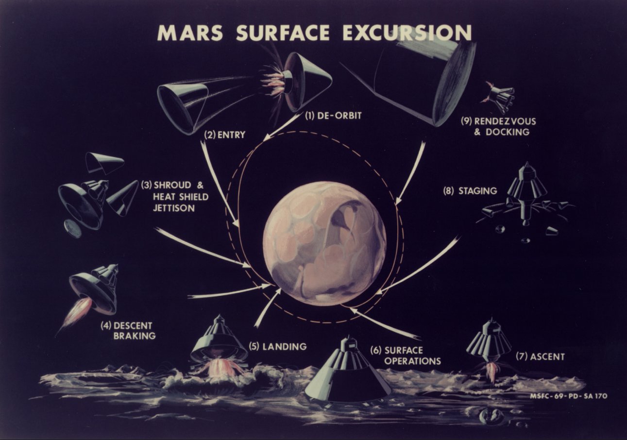 Презентация Вернера фон Брауна 1969 года по пилотируемой высадке на Марс с великолепными иллюстрациями Это полностью тормозной (с активным маневрированием) полёт продолжительностью 270 суток с использованием ядерных ракетных двигателей, включающий гравитационный манёвр у Венеры, для которого требуется сборка ступеней общей массой около 725 тонн на низкой околоземной орбите (НОО), с возвращением на Землю после примерно 640 суток общей продолжительности экспедиции. https://ntrs.nasa.gov/api/citations/20240011937/downloads/1969-08%20MSFC%20von%20Braun%20-%20Manned%20Mars%20Landing.pdf