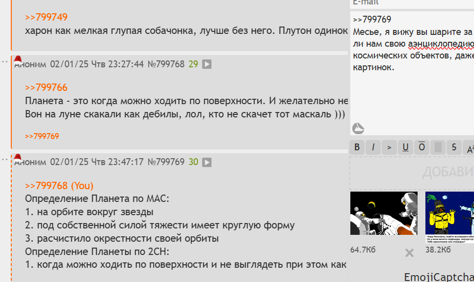 >>799768 Определение Планета по МАС: 1. на орбите вокруг звезды 2. под собственной силой тяжести имеет круглую форму 3. расчистило окрестности своей орбиты Определение Планеты по 2СН: 1. когда можно ходить по поверхности и не выглядеть при этом как долбоеб