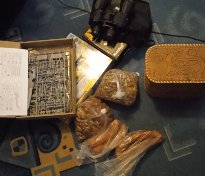 Бля, пиздец я бухой, съездил в город и купил бенокль вот такой, модель вертолёта ми-24, коробочку из бересты, килограм чищеных фисташек, полкило орехов пикан, 4 сардельки из свинятины и 2 пачки марльборо. И бутылку водки. Пиздец я ёбнутый? И ещё я мышью в пейнте люблю рисовать..