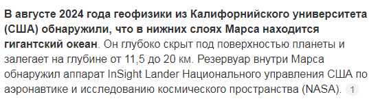 Пока пьяный копрокралсон/говнозаяц в запое и постит своё "творчество" тут, забыв, что он не в рисоваче, я, пожалуй, задам вопрос. СЕгодня подумал (когда срал) про гидрозатвор, не лающий запаху канализации валить в квартиру. А потом про Марс подумал. Может ли на Марсе прямо сейчас быть какая-нибудь пещера, в которой есть настоящая жидка вода или какая-нибудь грезесолевая жижа, которая отделяет внешнюю атмосферу Марса - крайне разряженную по земным меркам - от какой-то внутренней, из сети лабиринтов, подземной атмосферы, с земной или более плотностью? Гидрозатвор, если я правильно понимаю, кроме вакуума и очень низкогравитационных планеток, очень неплохо может держать воздух.