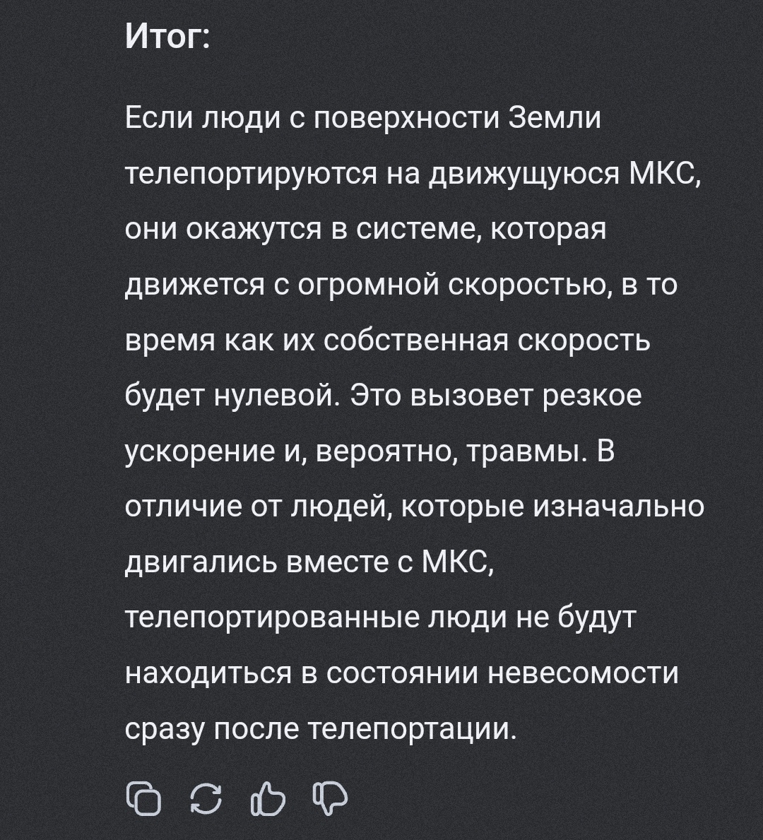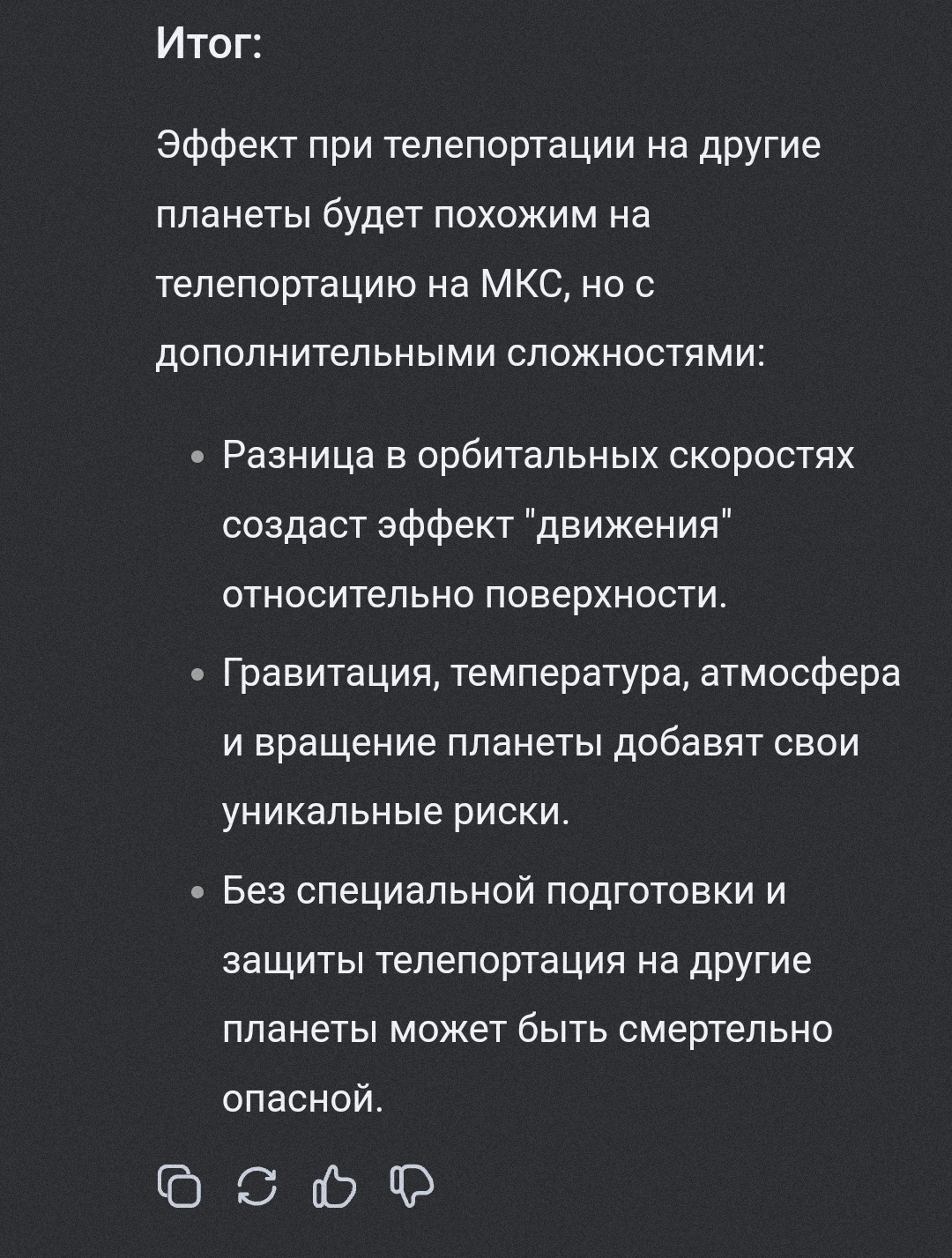 Задавал тупые вопросы нейронке и неожиданно выяснилось что телепортация за пределы Земли это полная хуйня! Даже если опустить факт того, что тебя разбирают на атомы и собирают заново, и по сути тебя уже не существует, только копия, то еще гравитация с орбитальной скоростью подсирают