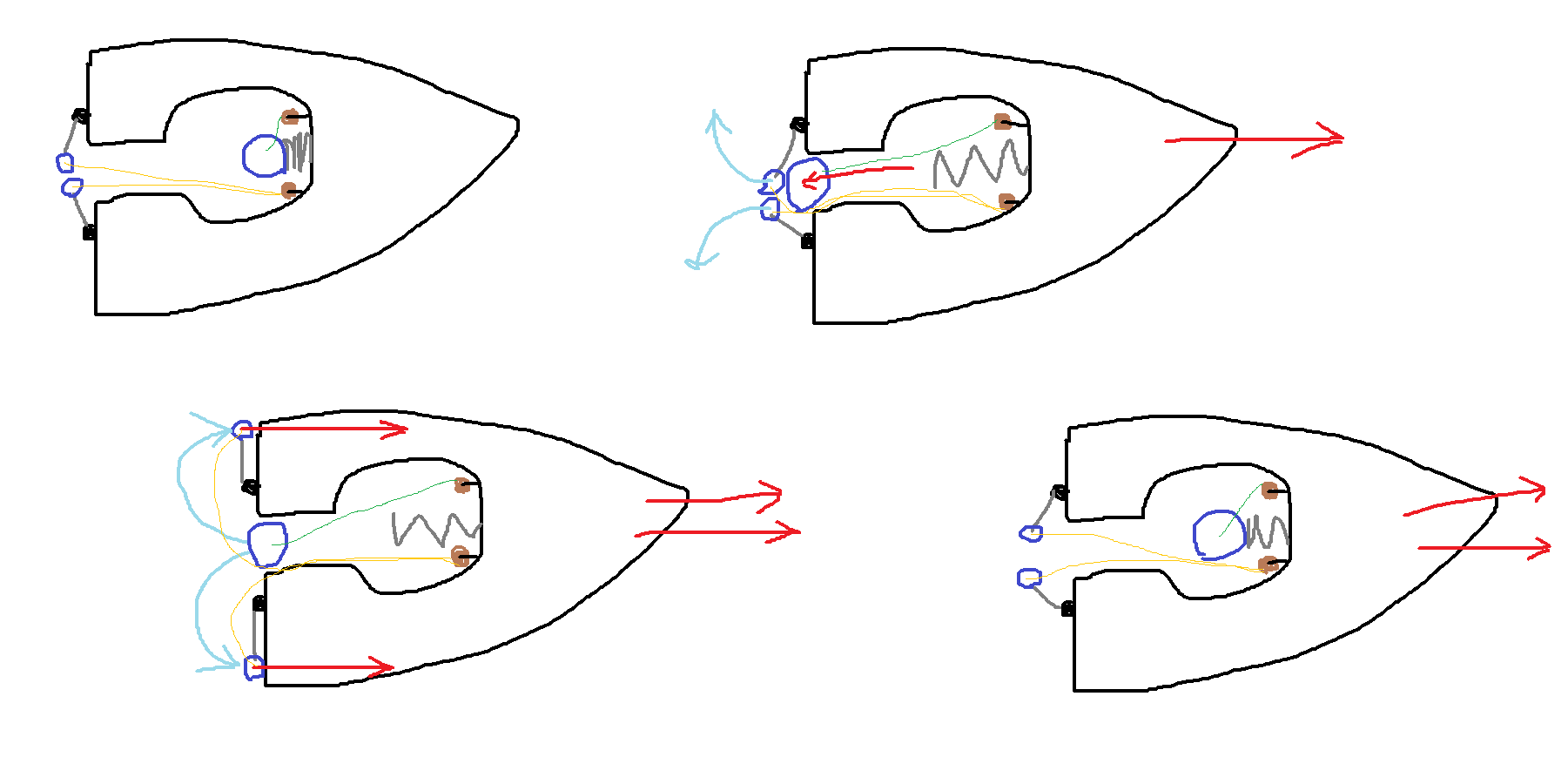 Придумал кинетический космический аппарат, который по идее не имеет потери в работы и энергии. Суть токова: есть некая пуля, внутри которой по центру по оси движения расположена пружина и ядро на привязи. Пружина натягивается и выстреливает ядром. В этот момент пуля получает толчок вперёд, а ядро - назад. Пуля летит вперёд на заданной первой энергии, но ядно, вместо вылета в пустоту, врезается в два молотка на плечах с шарнирами, и полностью передаёт инерцию в молотки. Теперь ядро из пружины полностью или максимально потеряло в кинетической энергии, а так как не покинуло пределов пули, может быть лего возвращено тросом/цепью/леской наматывается на шкиф. Молоточки же, в силу своей конструкции, просто развернуться и ударят в пулю с обратной стороны, давая пинка и лишь ещё больше направляя пулю по наравлению движения. Молоточки тоже по средствам тросов возвращаются в исходной положение, готовясь блокировать ядру путь и перехватывать его момент инерции в следующей итерации действия механизма