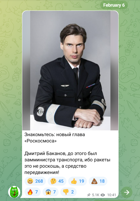 • Представление Дмитрия Баканова, нового главы Роскосмоса. • Обсуждение его карьерного роста и внешности. • Переход к обсуждению его предшественника Юрия Борисова.