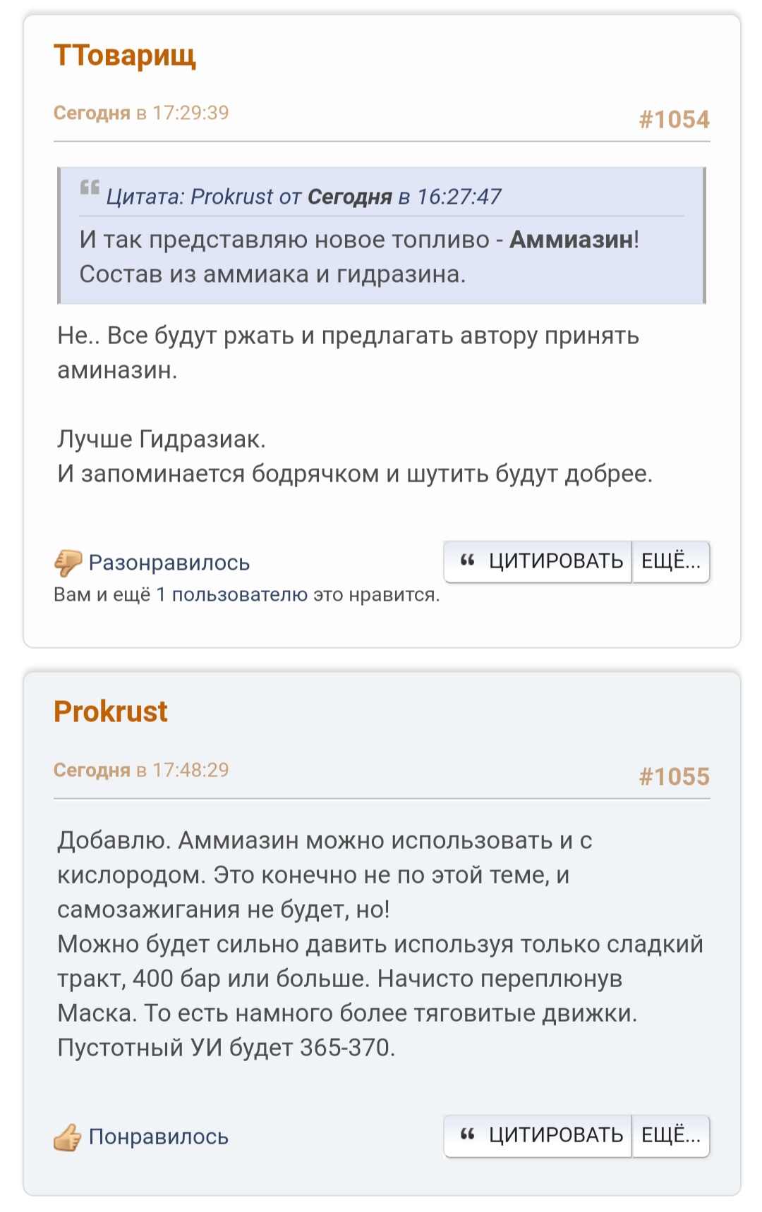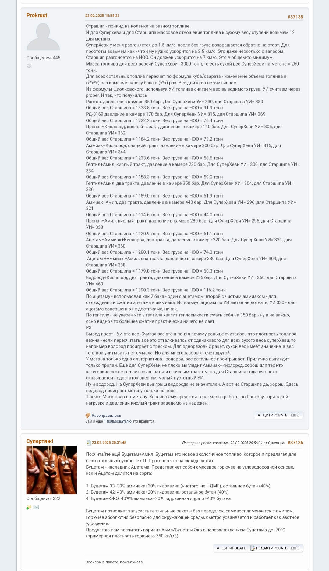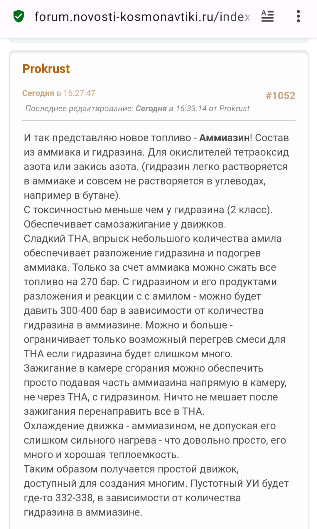 >>804692 Воот! Горд высоким уровнем родного Спейсача, что даже передовые топливные разработки знают. Единственная поправка, не 20% гидразина а 20% гидразин-гидрата. Это, во-первых, ради большей безопасности при проливах, у гидразин-гидрата ниже давление гидразиновых паров (больше вдохов потребуется для отравления). Во-вторых у гидрата температура замерзания -50 градусов, а у гидразина +2 градуса. В итоге Буцетам на гидрате можно переохлаждать, растёт плотность.