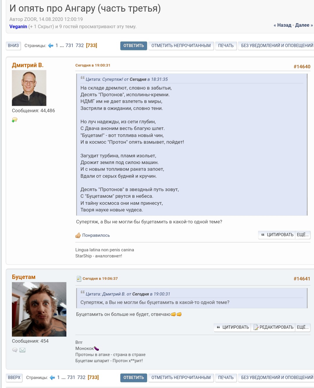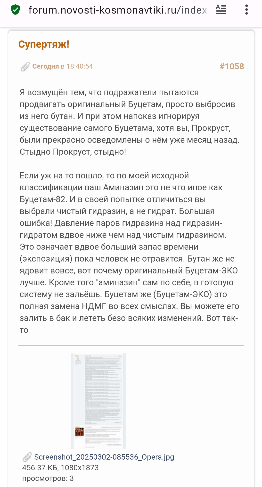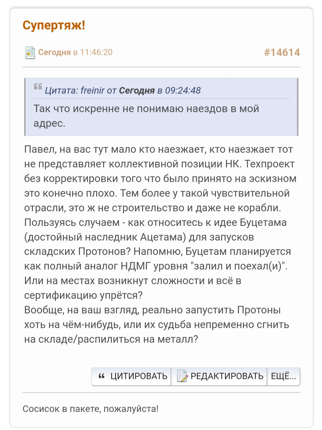 Задал вопрос Павлу Пушкину, проектировщику Ангары, директору Космокурса. В отрасли он вроде как не работает уже, но связи-то остались. Рокет пиплз должны знать о Буцетаме, всеми способами буду его продвигать, ибо 10 Протонов в тюрьме (на складе) смотрят на меня как на последнюю надежду!