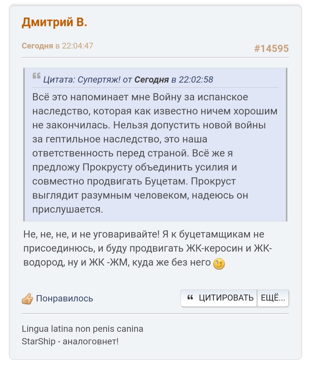 Странно...Буцетам начинался как мем, но пока я его форсил, даже сам осознал насколько же Буцетам охуенен. У него есть все преимущества гептила, есть даже те которых у Гептила нет (самонаддув и дешевизна). Но при этом пролитая лужа гептила это катастрофа для незащищённого персонала. А лужа Буцетама не токсичней лужи аммиака. Любой беспечный чувак в шортах просто сбегает за химкостюмом, не понеся никакого дамага. И через 15 минут вернётся во всеоружии и ликвидирует чёртову лужу. А Буцетам терпеливо подождёт, он долго-долго выкипает. Я уже буквально хочу поскорее залить такой хороший экоБуцетам в баки своего Дракона и полететь в космос, попыхивая импульсами из системы ориентации во все стоороны. Илон Маск, почему он так ещё не сделал? Да потому что не додумался до Буцетама. А я додумался, я продвинул Русский Космос, и Протоны полетят вперёд. Ура Русскому Космосу! Ура мне!