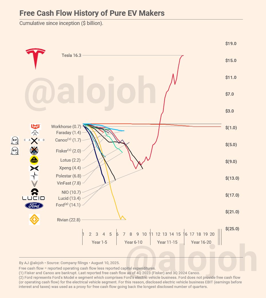 Основные наблюдения: 1. Бизнес электромобилей — отстой. 2. Только Tesla удается генерировать положительный свободный денежный поток. 3. За исключением Tesla, указанные компании зафиксировали сгорание денежных средств на сумму 88 млрд долларов (чистый отрицательный кумулятивный свободный денежный поток). 4. С точки зрения расходования денежных средств Rivian является самым неэффективным производителем электромобилей: никто не добился более высоких расходов денежных средств, даже близко.