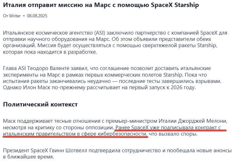 Ты что не здешний? Маск в прошлом году летал трахать Мелони - она в благодарность запилила ему контракт на 1,5 млрд евро для правительственной связи через Старлинк. Но когда Маск заболел Трампом - контракт пошел по пизде - из-за опасений тирании и прочей хуйни в США. Может сейчас Маск опять потрахал Мелони, убедил, что он не с Трампом, хз