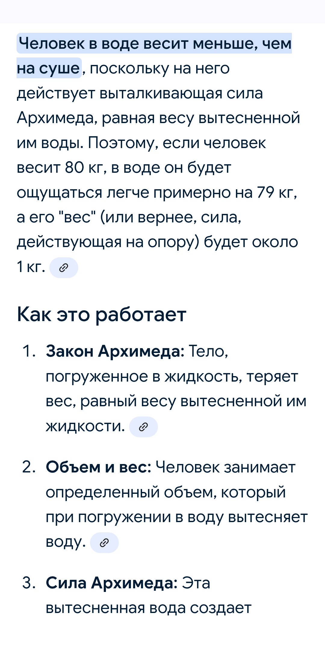 >>819953 Ебучие нейросети точно породят поколение дебилов. В бассейне у тела масса точно такая же 80 кг и перегрузка та же самая единичка как если бы оно стояло на земле. Вся разница что опора распределена на все тело вместо ног. Так же и воздушный шар вися в воздухе испытывает перегрузку 1 и его экипаж тоже. Но в случае ракеты инерция прижмет тело к стенке капсулы и будет то же самое как без воды. Только дополнительно еще вода будет давить сверху