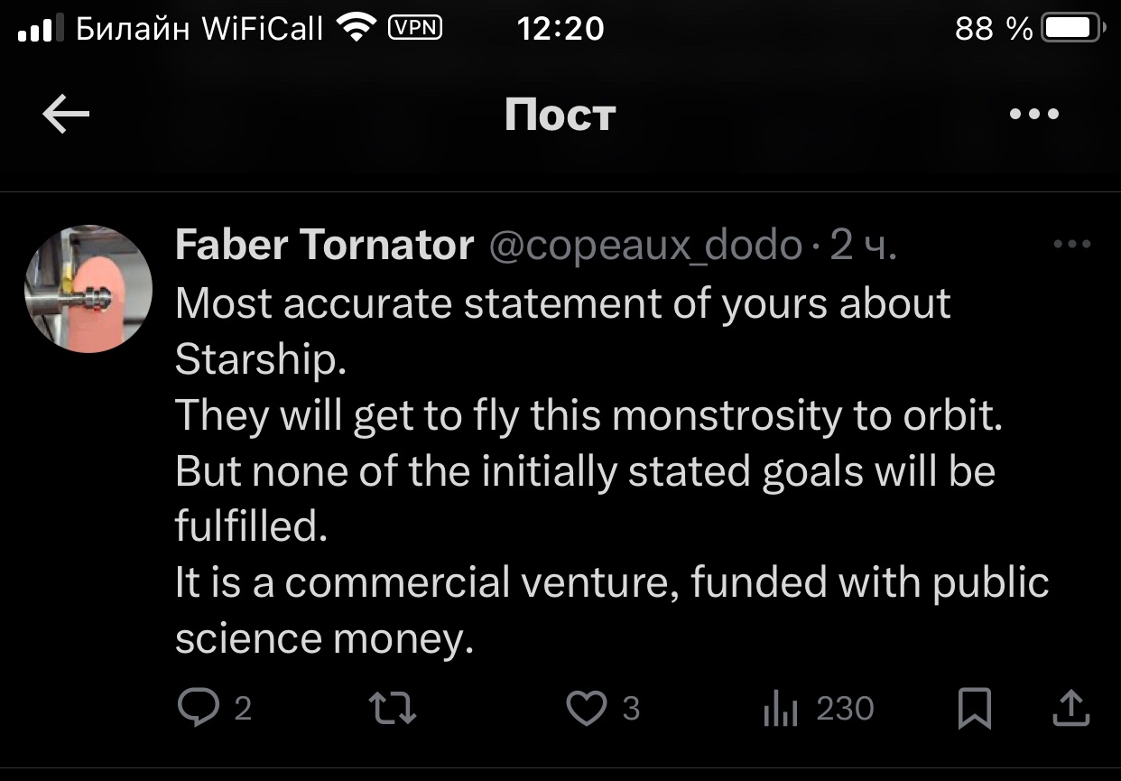 Если честно, вообще пахую частник или не частник, у нас вон в совке без единого частника целых 2 сверхтяжа сделали ещё в прошлом веке. Эти споры ведут в политосрач. Важно то, что у американцев очень скоро будет рабочий многоразовый, или пока что частично многоразовый супертяж. И вот что они будут на нём выводить кроме сралинков, и сколько это будет стоить в конечном итоге за кг, вот это намного интереснее. Все кто пишет что Маск прогорел и мошенник дурачки.