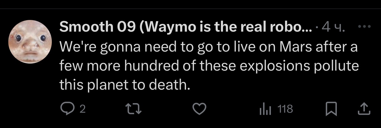 Я просто напомню, что делал Сатурн на своем 11ом полете >Ряяя было бы у свитого Илония такой бюджет, как у Аппалона он бы уже всех людей на планете на Марс и обратно бесплатно покатал Во-первых, бюджет Аполлона это не только ракета, а еще куча всего типа роверов, обучения астронавтов. Во-вторых, Илошиных пол триллиона хватило бы на весь Аполлон.