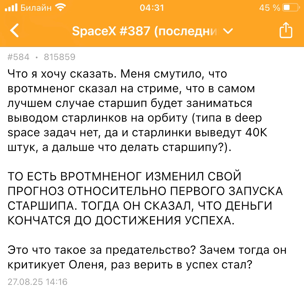 >>820741 Еще Тим задался вопросом в конце стрима: что произойдет дальше раньше: запуск чоловiков к Луне покрутиться вокруг (без него, хотя он должен был быть следующим по плану 2022 года), или запуск 11го старшипа? Я ставлю на 11й старшип. Потому что обосрался не один лишь Олень, но еще и НАСА. НАСА так и не запустит чоловiков, придумают еще какую-нибудь причину отложить Артемис 2.