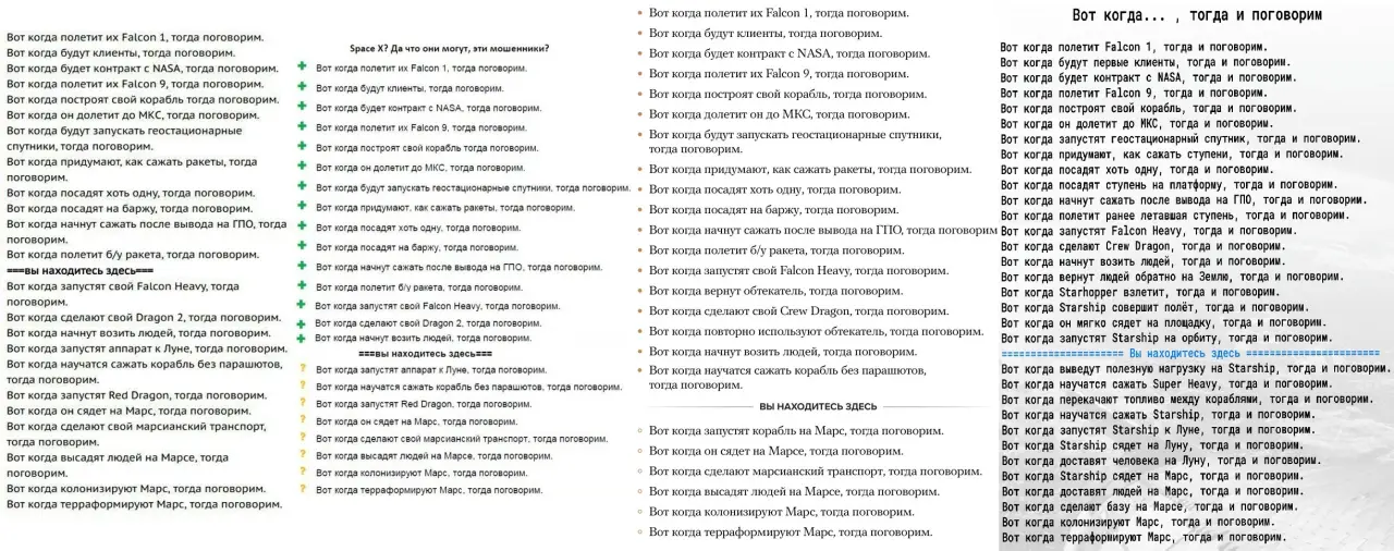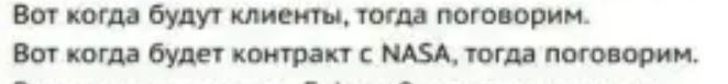 >>821258 >куда мне придти открыть свой бизнес, чтобы мне деньги давали ограниченно с требованием результата? >Первое из них очевидно - это помещение. Где мне дадут денег на помещение? Дальше дайте денег на мебель и оборудование. Потом дайте мне курьеров и транспорт. Короче совсем шиза пошла. Прибежали НАСА к Маску, начали пихать деньги в карманы, лобызать в уста, предлагать выпить, породниться. А то что у Маска уже была на тот момент команда доведшая орбитальную ракету до начала летных испытаний и он с этой командой пошел на объявленный НАСА конкурс на разработку это так, совпало. А то что он в рамках заключенного контракта сначала промежуточные результаты выдавал а потом контракт выполнил это вообще не считается.