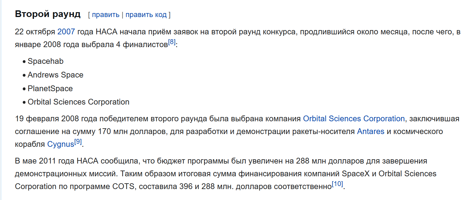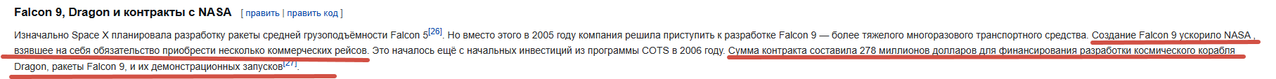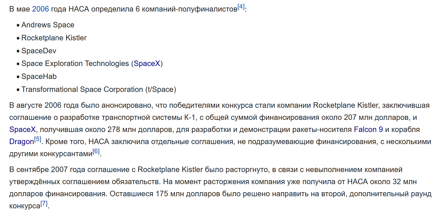 На момент 2009 SpaceX получили только SpaceX $234 млн из $278 млн по контракту. Это показывает, что деньги выплачивались по мере выполнения задач контракта, а не так что ему дали $300 млн и типа попиливай как хочешь. Потенциальный SpaceX - Rocketplane Kistler - обосрались, погорели и канули анналы истории. Это могло ожидать и Машка, при этом никто бы ему не вернул его вложенные $100 млн.