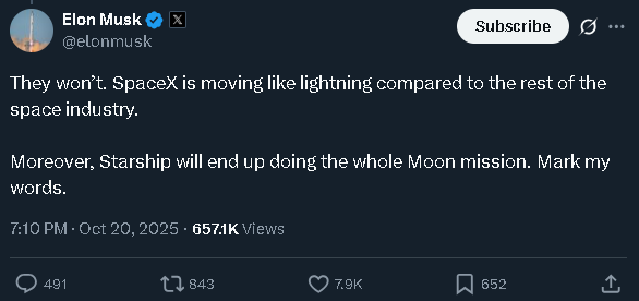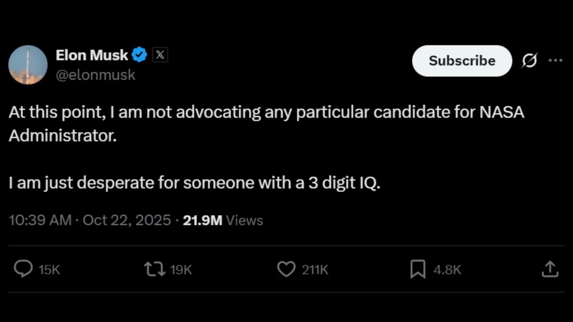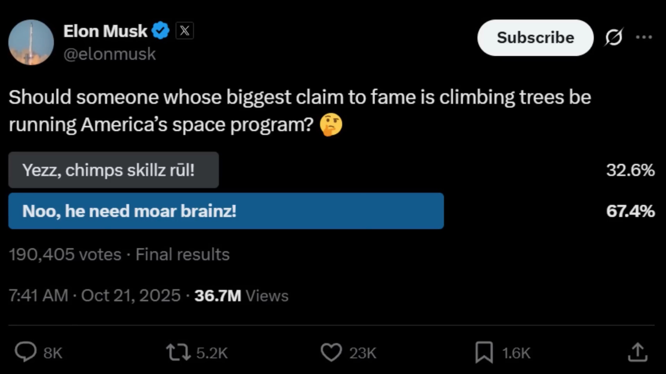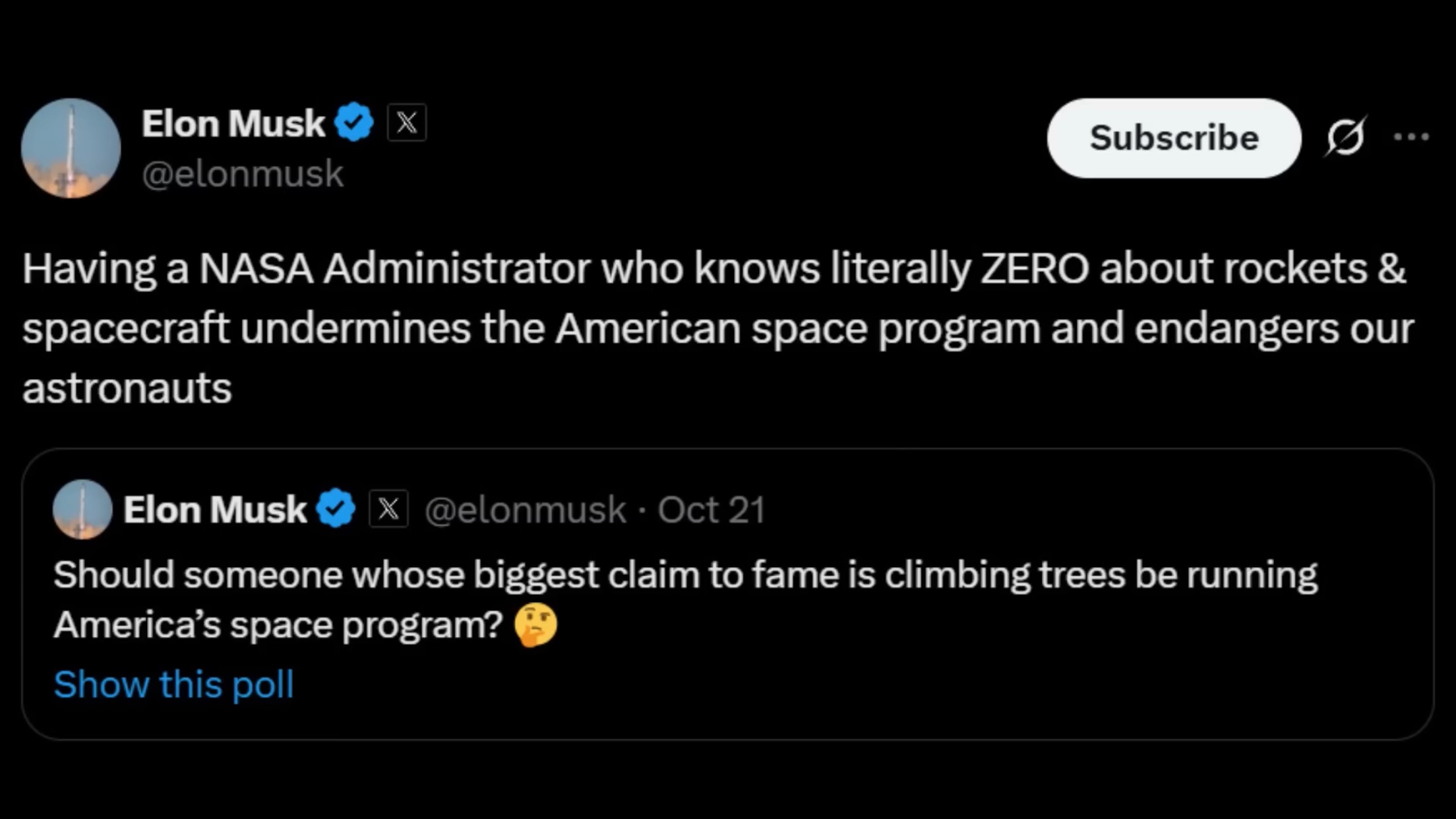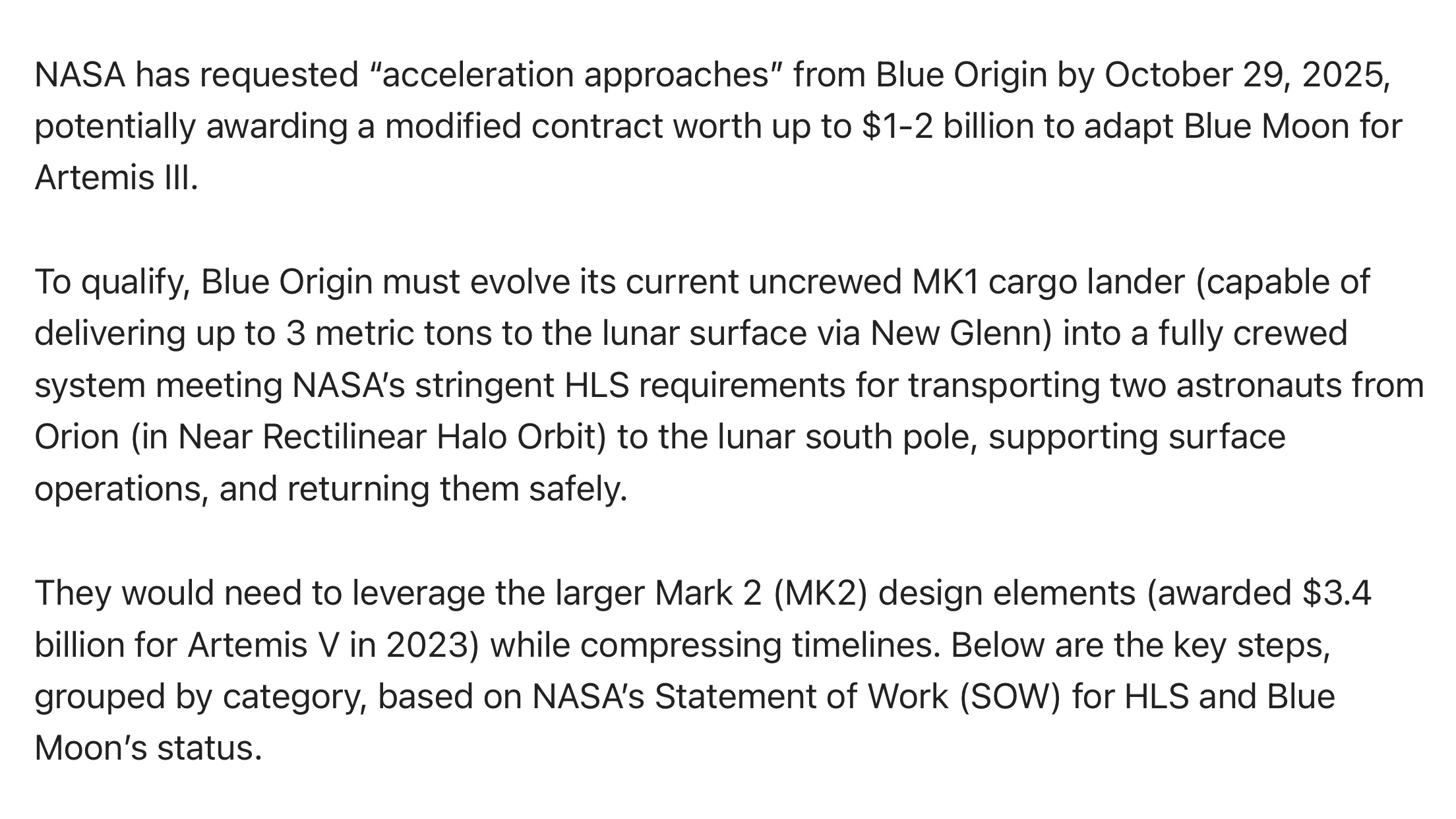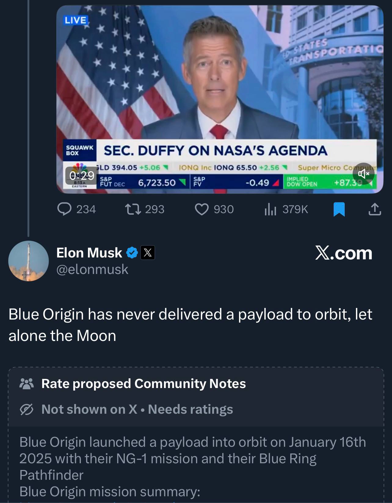 Есть еще такое соображение от ютубера Angry Astronaut: Олень ведь обозвал и вообще зачморил главу НАСА в твиторе. Он не стал бы это делать, если бы не понимал, что УЖЕ ВСЁ ПРОЕБАЛ. Больше денег ему НАСА не даст и он это знает. Значит всё, только вариант Blue Moon остается в гонке.