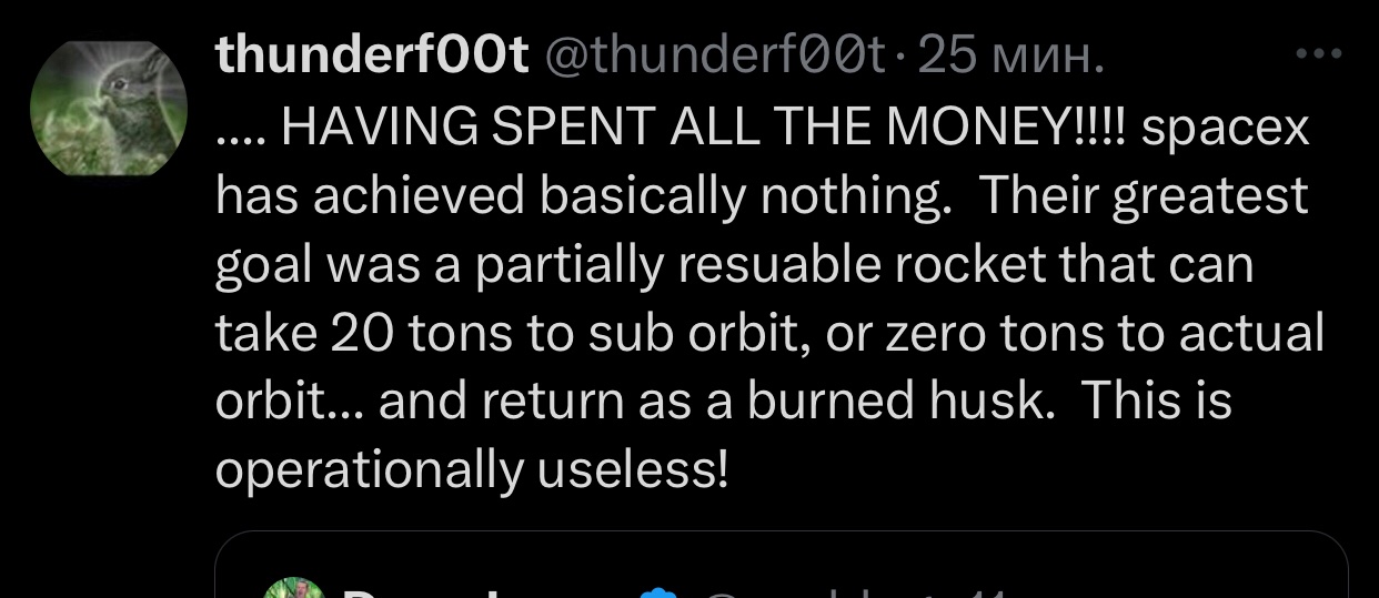 Еще, обратите внимание. Я уже на прошлом полете обратил. МОШЕННИКУ важнее поскорее высрать побольше старлинков из Страшипа, чем не ударить Америку лицом в грязь и выиграть лунную гонку с китайцами. Какое отношение высирание макетов старлинков вообще имеет к программе Артемис? Наебалово это всё посоны, следить надо за китайской лунной программой. Только китайцы такого шоу из тестовых плетов не устраивают, к сожалению.