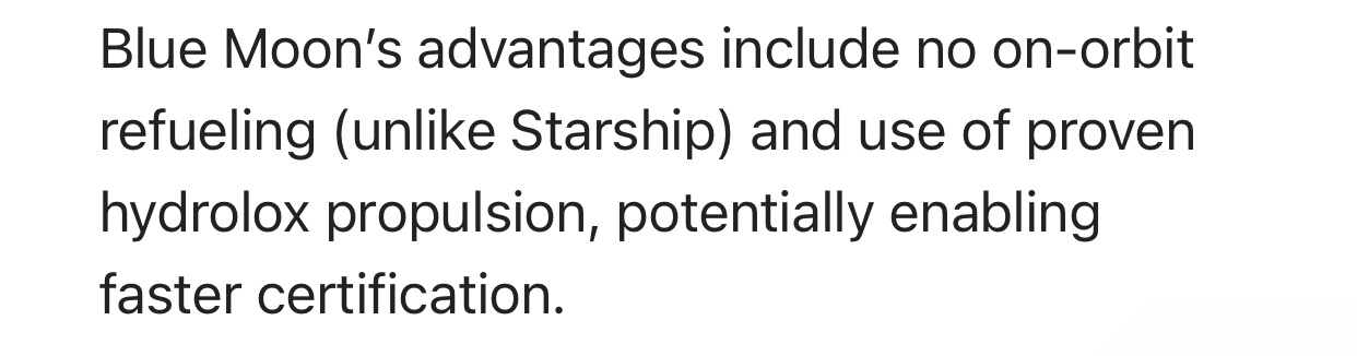 Не завидую НАСЕ - у Blue Moon тоже еще конь не валялся, чето я почитал и понял, что не факт, что Blue Origin быстрее Оленя справится (оба тупо полный провал сроков сделают). Но все-таки если без ордитальной дозаправки, то у Blue Moon побольше шансов.