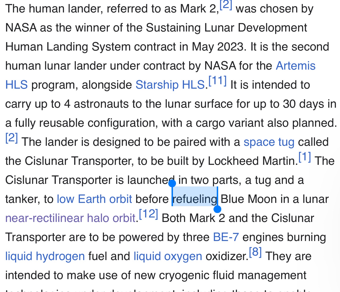 https://en.wikipedia.org/wiki/Blue_Moon_(spacecraft) Из вики >Development of the smaller, uncrewed lander (Mark 1) began in 2016 and was publicly revealed in 2017. It is planned to be capable of delivering up to 3.0 tonnes (3.3 short tons) of payload to the surface of the Moon.[8] Originally envisioned as a way to gain experience with lunar landings and to support technology development, Mark 1 is also marketed independently of Mark 2. The lander has been proposed for a number of projected roles; an initial goal was a lunar south pole landing, where it was proposed that a series of landings could be used to deliver the infrastructure for a Moon base. >The human lander, referred to as Mark 2,[2] was chosen by NASA as the winner of the Sustaining Lunar Development Human Landing System contract in May 2023. It is the second human lunar lander under contract by NASA for the Artemis HLS program, alongside Starship HLS. Это то, как планировалось делать РАНЬШЕ. А ТЕПЕРЬ Даффи форсирует события и автоматический лэндер марк 1 ВОЗМОЖНО модифицируют под чоловiка!!! Это единственный шанс обогнать китайцев, других вариантов просто нет.