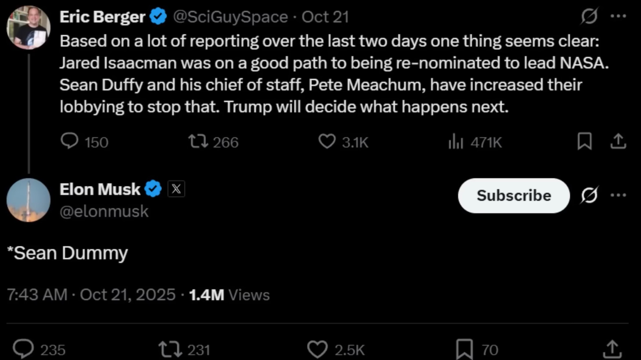 Шон Даффи снова в прямом эфире CNBC пообещал «открыть контракт» для системы посадки на Луну в миссии Artemis 3, потому что «SpaceX отстаёт».