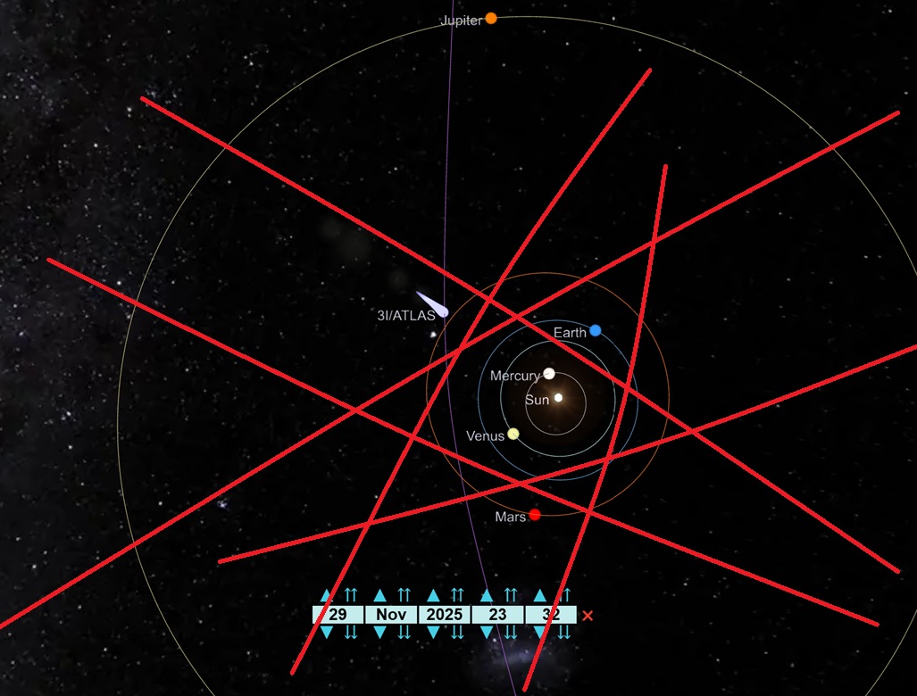2. P=0,00005 : Время прибытия 3I/ATLAS было точно подобрано, чтобы он находился на расстоянии десятков миллионов километров от Марса, Венеры и Юпитера и был ненаблюдаем с Земли в перигелии (см. здесь ).