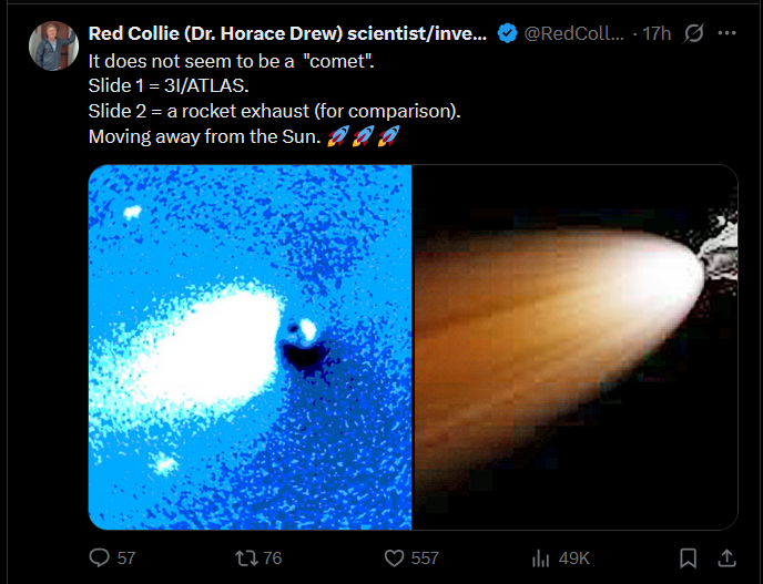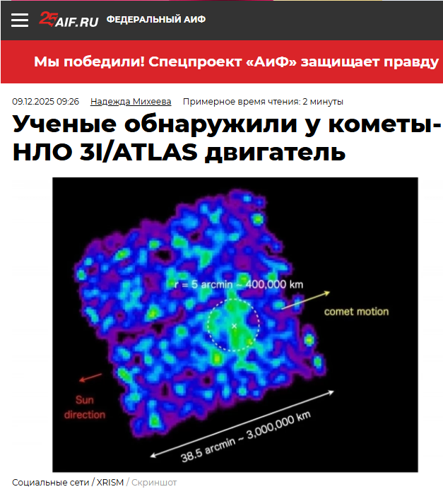 «Я снова взглянул на наблюдения XRISM и нашел неопровержимые доказательства…Эта комета светится в рентгеновских лучах так же, как двигатель космического корабля, а не так, как должен светиться тающий снежок. Вот почему многие ученые сейчас тихо говорят: "Э-э... ребята, эта штука на самом деле может быть зондом"»,– говорится в одном из постов. В других постах говорится про некоего ОПа и его мать, а также бессвязные упоминания "тяночек", "лисичек", возможно оправдывающие промискуитет. Уточняется, что телескоп XRISM 6-8 декабря сделал новые снимки межзвездного объекта, благодаря чему стало понятно – свечение объекта имеет неправильный цвет (слишком много зелено-голубого углерода и азота, почти нет кислорода); он светит по направлению к Солнцу, а не от него; свет постоянный и чистый, как включенный свет, а не мерцающий, как костер. «Факт: именно такой цвет и форму мы видим каждый день в камерах для испытаний ракетных двигателей на Земле (настоящие двигатели, работающие на азотном или углеродном топливе)». https://aif.ru/society/science/uchenye-obnaruzhili-u-komety-nlo-3i-atlas-dvigatel?ysclid=miy7y9rcg2110626573