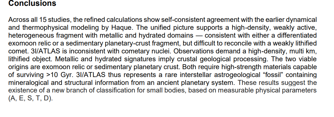 1. P<0,1: Газовый шлейф, окружающий 3I/ATLAS, содержит всего 4% воды по массе, что является основным компонентом известных комет Солнечной системы (см. здесь ). Этот шлейф мог образоваться в результате высвобождения солнечным светом льдов и пыли, накопившихся на поверхности технологического объекта во время его движения в холодной межзвёздной среде.