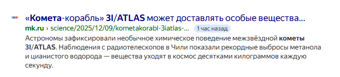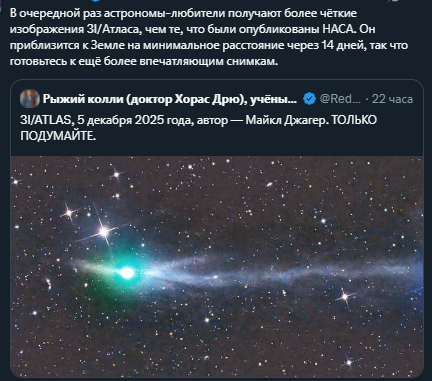 Летит и бздит. Межзвездная комета 3I/ATLAS показала аномально резкое нарастание выделения газов Источник: New-Science.ru https://new-science.ru/mezhzvezdnaya-kometa-3i-atlas-pokazala-anomalno-rezkoe-narastanie-vydeleniya-gazov/ Ученые искали признаки выделения двух ключевых газов — цианистого водорода и угарного газа, которые обычно указывают на активность комет. Однако на таком расстоянии эти газы обнаружены не были, что позволило установить рекордные пределы их возможного содержания. Самое интересное открытие ждало исследователей, когда они объединили свои данные с более поздними наблюдениями других обсерваторий. Оказалось, что по мере приближения к Солнцу активность кометы 3I/ATLAS нарастает необычайно быстро — в десятки раз стремительнее, чем у обычных комет нашей Солнечной системы. Если у «местных» комет выделение газов увеличивается постепенно, то у этой межзвездной гостьи оно буквально взрывообразно. «Это все равно как если бы обычная комета разгоралась как свечка, а 3I/ATLAS — как факел, в который внезапно подлили бензин», — поясняют ученые.