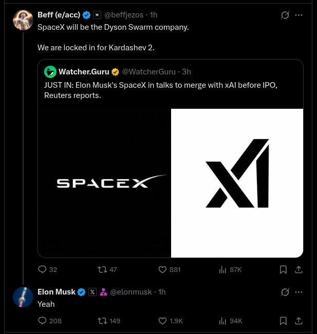 Илон Маск, этот безжалостный капиталист, жадный до абсолютной власти и триллионов, затеял слияния, чтобы слить свои империи в одну монструозную машину прибыли. Сначала SpaceX поглотит xAI: акции xAI обменяют на доли SpaceX, Grok интегрируют в ракеты и Starlink, чтобы ИИ пожирал данные с орбиты и шпионил за всем миром под его контролем. Это укрепит планы Маска ставить дата-центры в космосе, где вычисления станут недостижимы для конкурентов и регуляторов. Затем, если инвесторы Tesla надавят, SpaceX может слиться и с Tesla: электромобили, автопилот и роботы Optimus попадут под одну крышу с ракетами, превратив каждую машину в узел его тотальной сети. Переговоры идут тихо, без фанфар, но с холодным расчётом — всё ради консолидации империи перед IPO SpaceX, которое сделает его ещё богаче. Конкуренция умрёт, privacy исчезнет, а люди станут просто источником данных и дохода для "Eloncorp". Маск не строит будущее — он его монополизирует, пожирая компании одну за другой в погоне за бесконечным контролем и деньгами. В итоге человечество окажется в ловушке его экосистемы, где каждая звезда, каждый заряд батареи и каждый твит принадлежит только ему. И цена этой жадности — свобода, которую никто уже не вернёт.