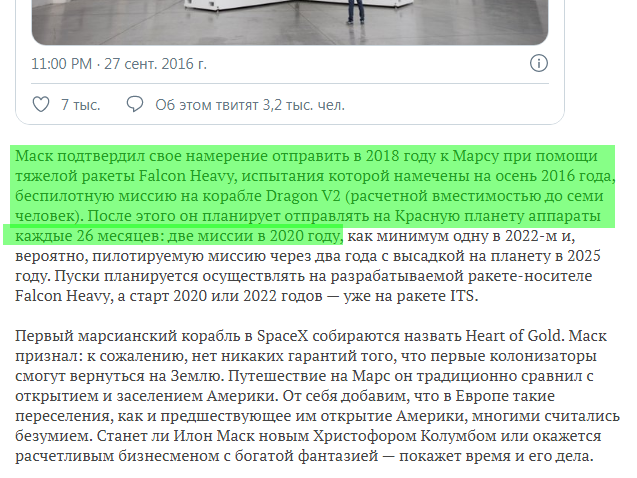 >>832035 Ты оптимист. Более реалистичным вариантом мне кажется что после вляпывания в политику и нерыночные механизмы давления ментальное состояние Маска настолько ухудшилось, что он уже не тянет Марс.