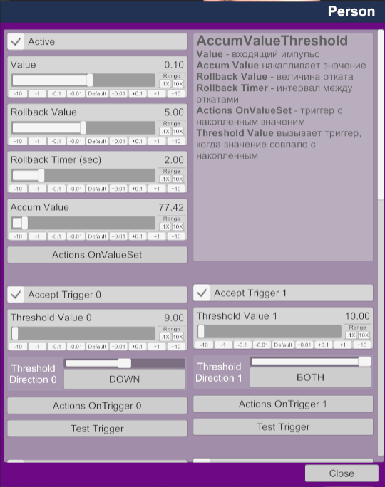 https://mega.nz/file/CwsmFTLR#aTruJbZGd0z7L4UMNLuMPZzVI-chMxs3Mwtzm5mz-ag Новое: теперь есть таймер и величина отката добавил триггер накопленной величины, чтоб её значение передавать в другие плагины, как есть - в реальном времени. Но почему-то в настройках ползунок TestTrasition имеет максимальный предел в единицу. А у меня накопитель размером до 1000. Я сделал значение в триггере делёным на 1000, но это не решило проблему. Как-нибудь потом разберусь