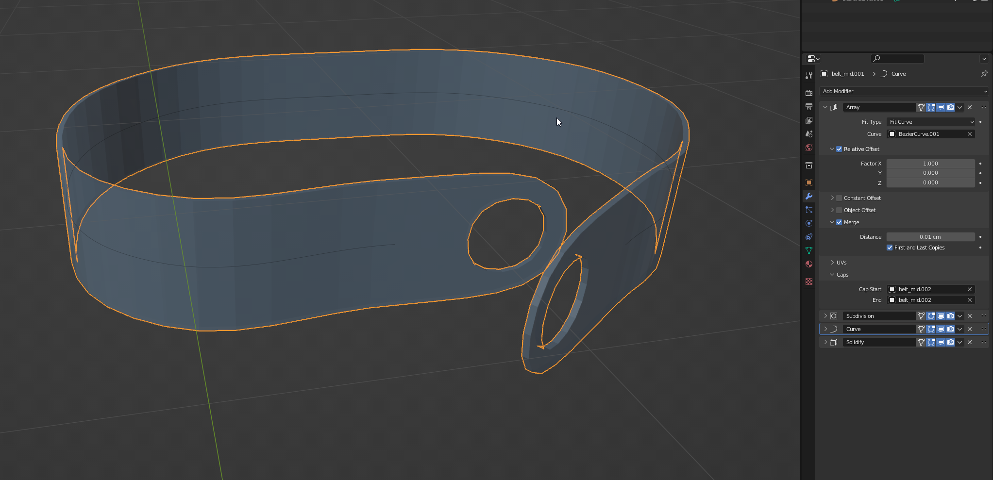 Как сделать в блендере чтобы начало и конец в модификаторе аррэй ремня подчинялись курве? А то они продолжаются прямой линией - из-за этого не могу завернуть ремень кругом вокруг персонажа.