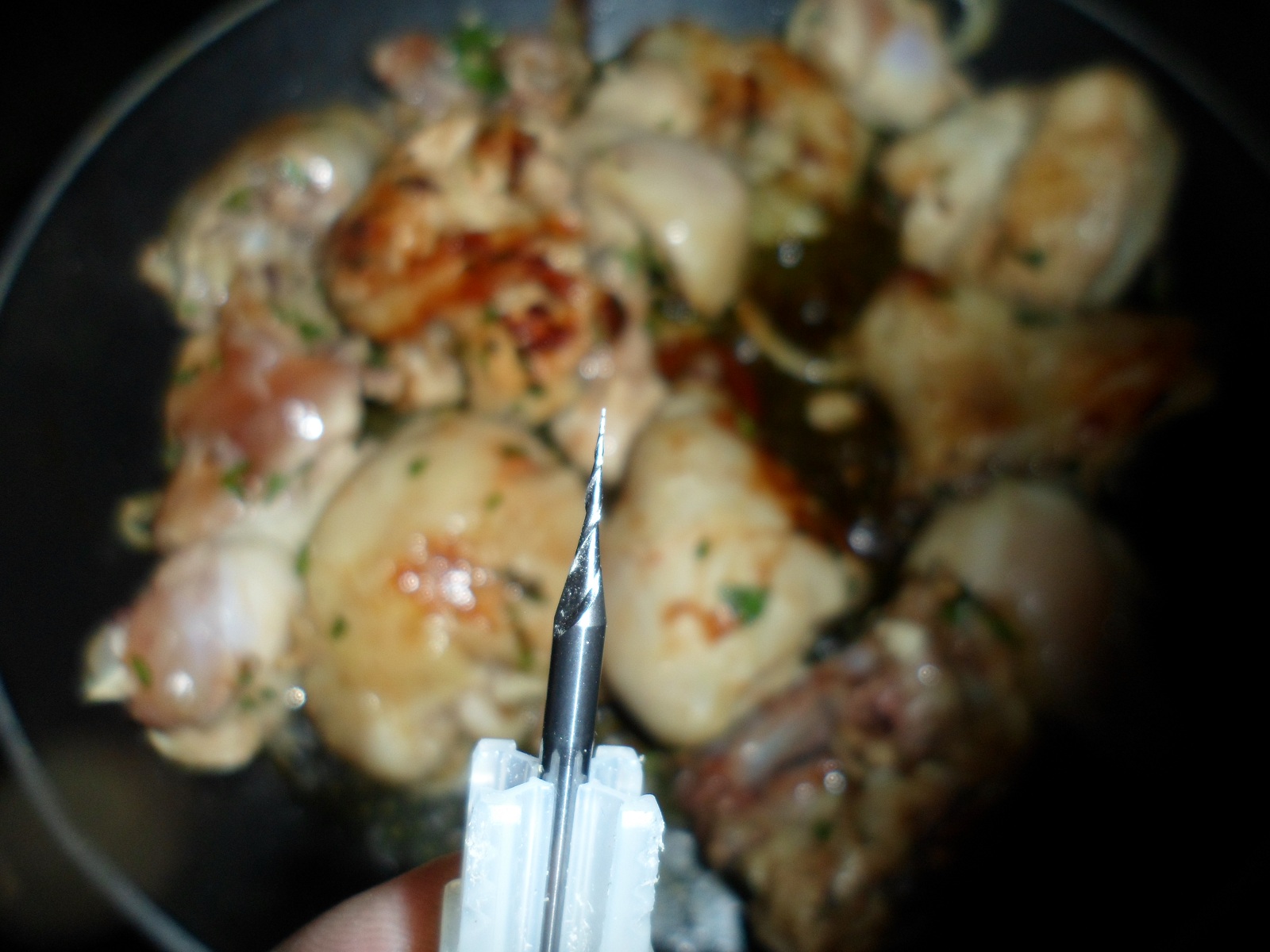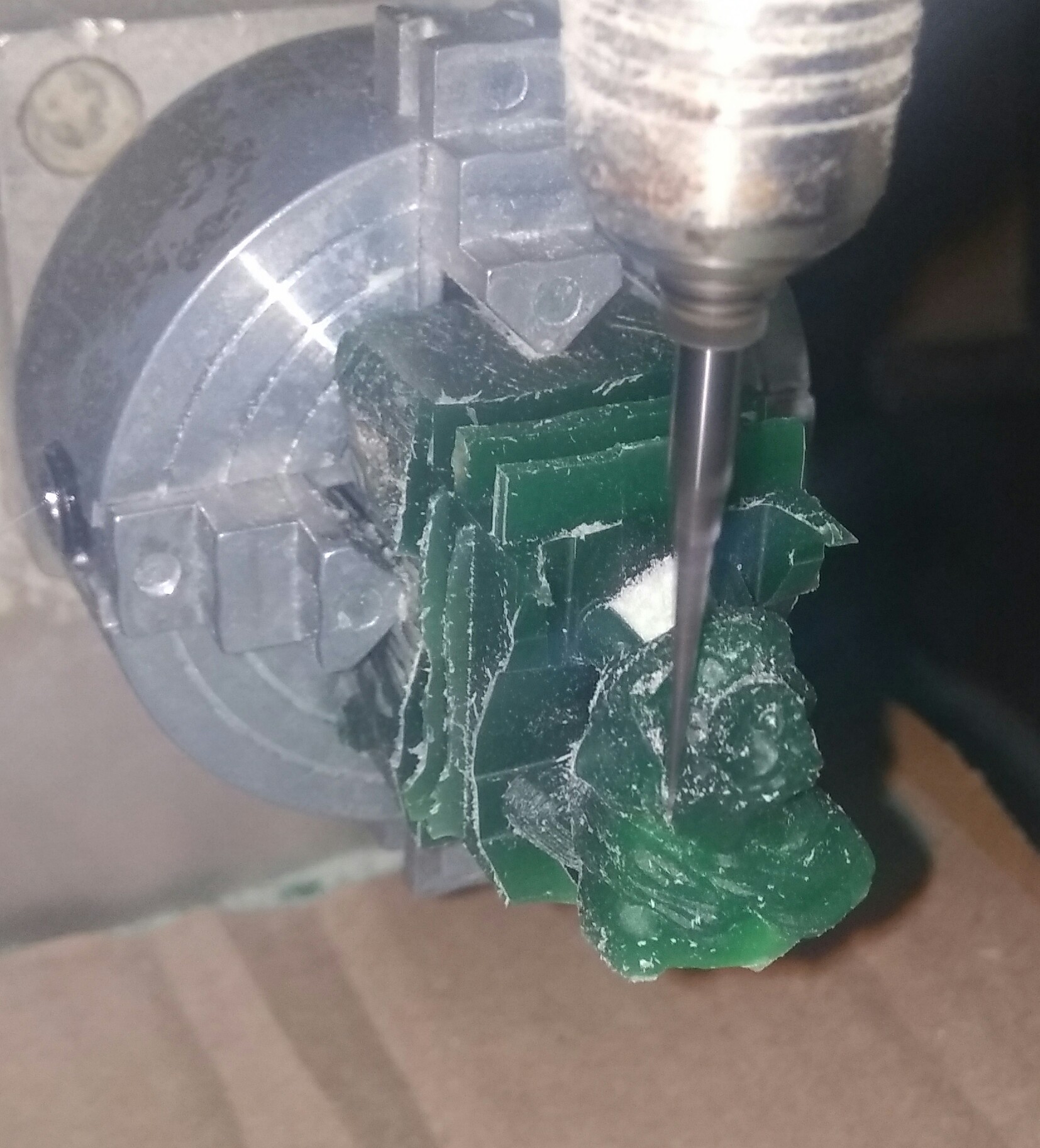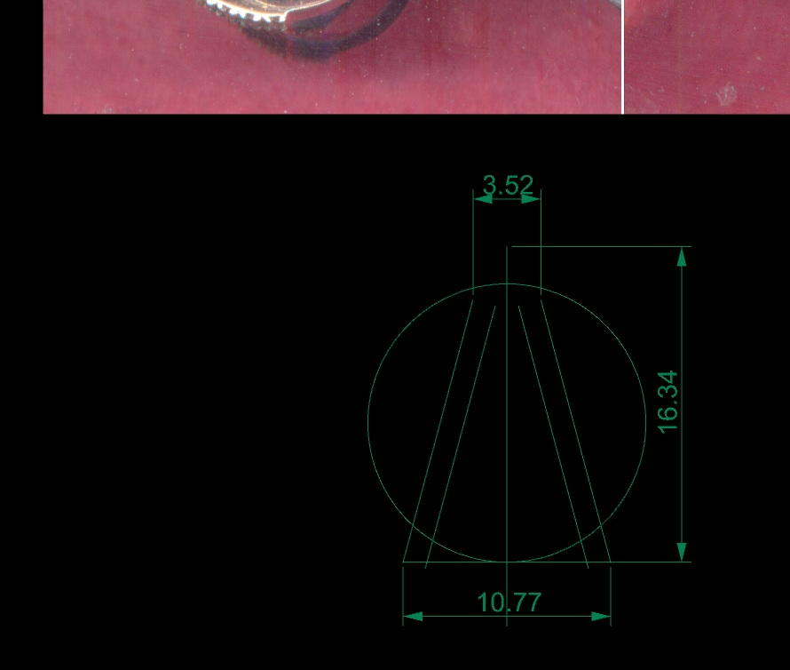 Основу бы обработал на поворотной оси. Часа 3,5 вместе со всей подготовкой резки "шурупом" 0,127мм диаметр "круглой" пятки, угол на сторону в 5 или 3 градуса, шаг 0,03мм. Перед этим пробил бы диаметр торцевой 3,175 и сделал бы выборку сверху, этого бы хватило