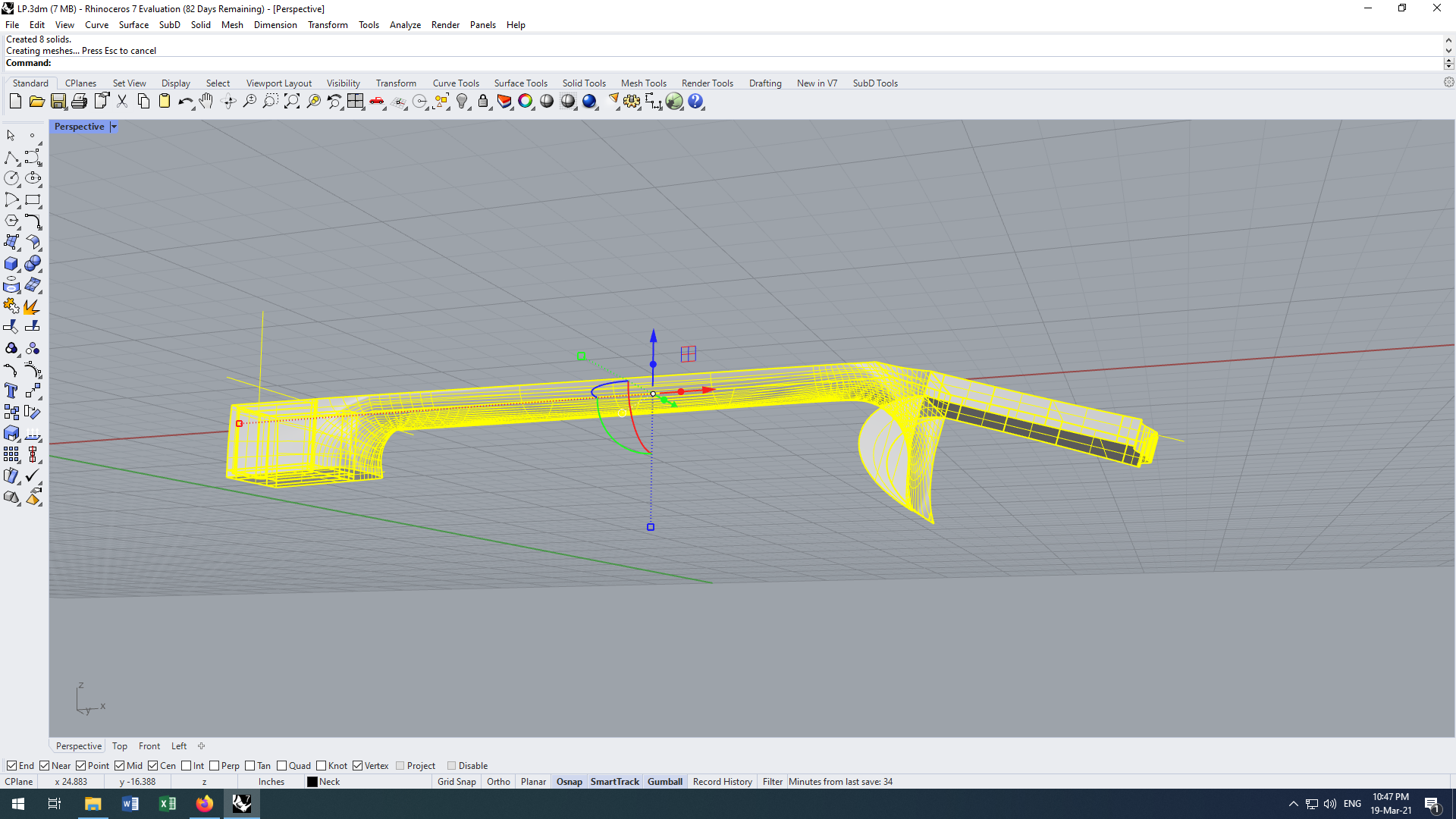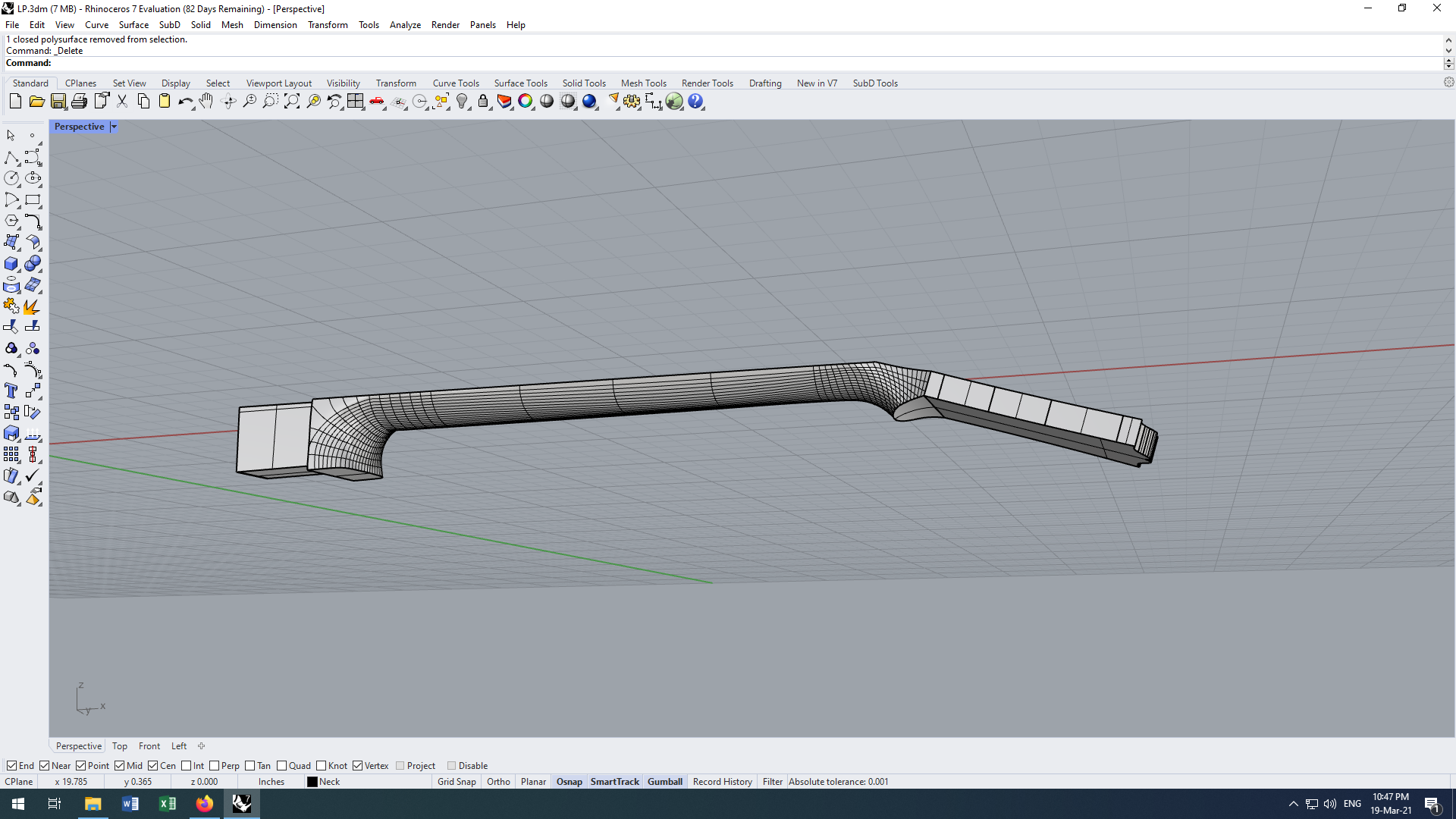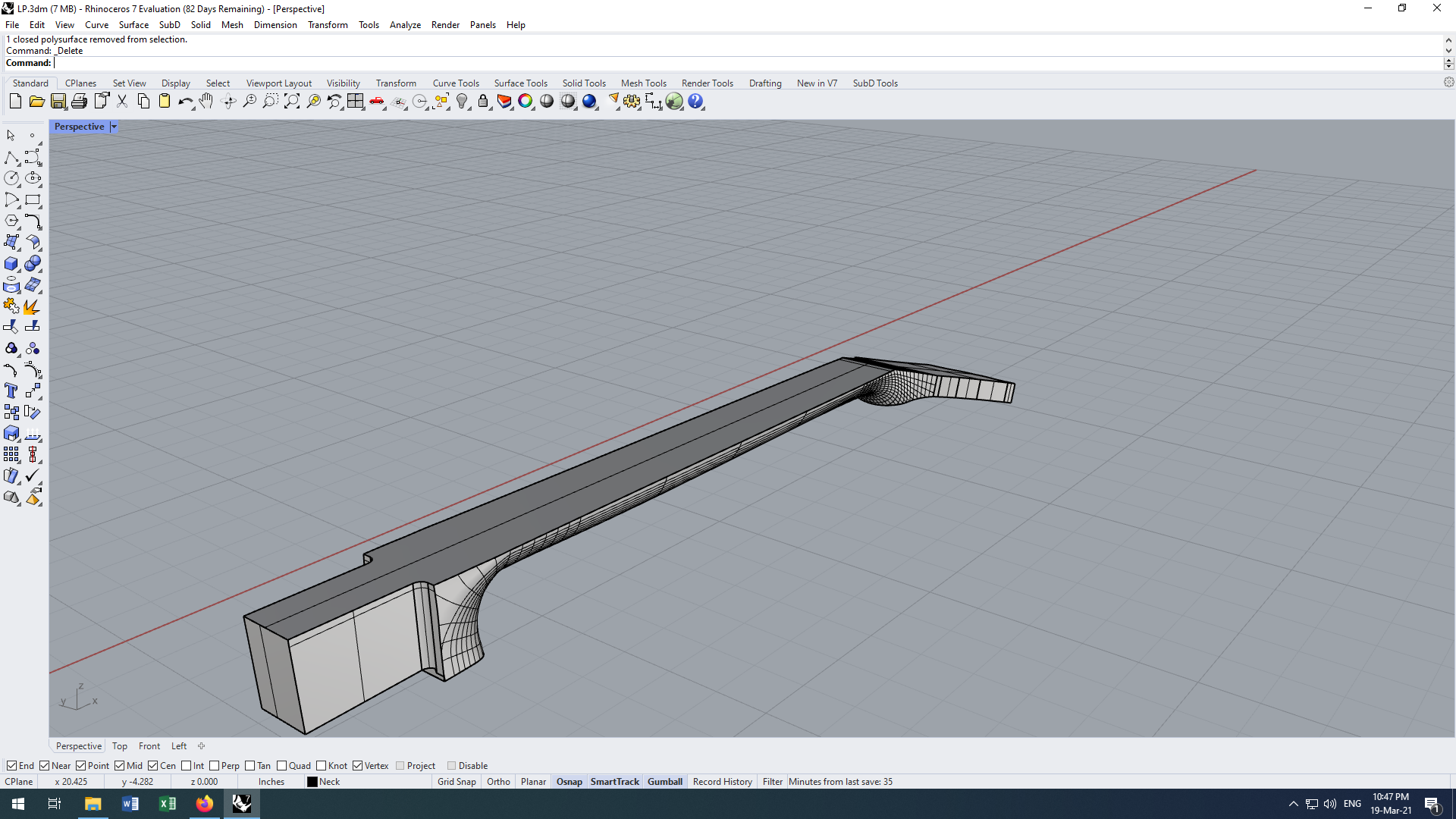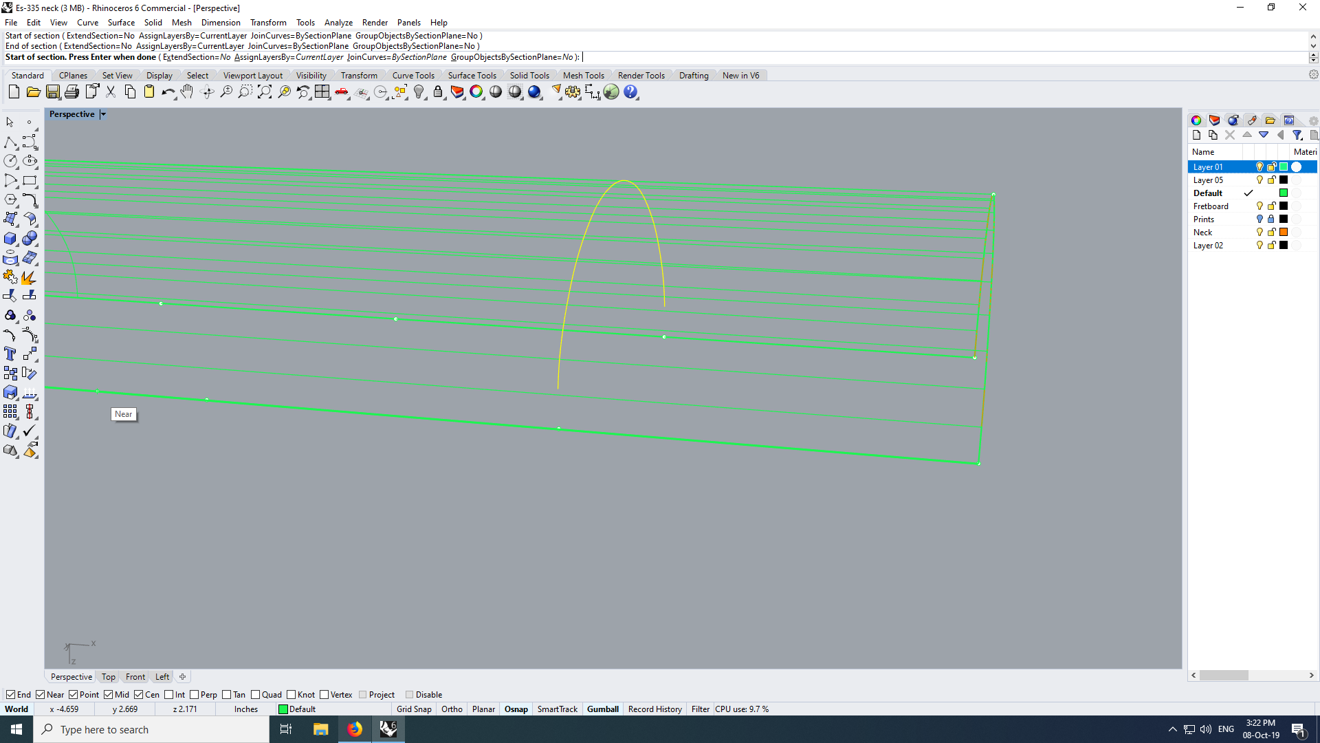 Попробовал Fusion: импортировать в него кривые не вышло, все они непотребные, редактировать невозможно. Продолжаю эпопею с Носорогом. Пытаюсь сделать гриф. На основе поверхности хотел сгенерировать профили командой "Section", опираясь на точки, лежащие на двух прямых по краям. Эта падла почему-то не делает профиль от точки до точки. В чём может быть проблема?