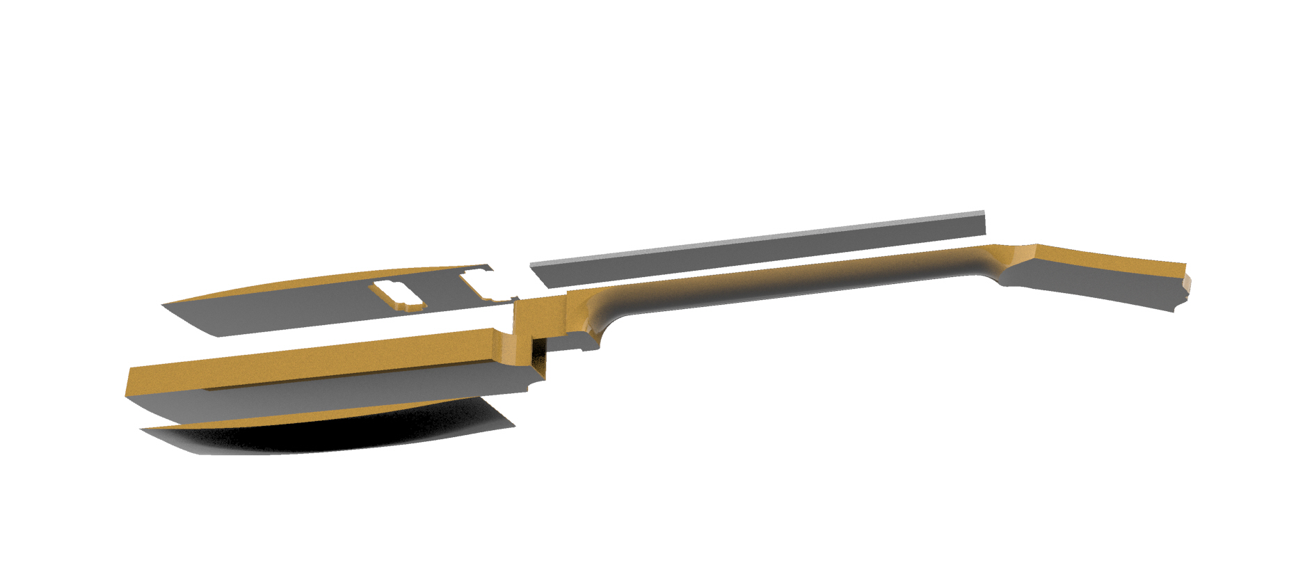 На самом деле пришёл к выводу, что для Cam можно было делать абсолютно иначе: не честно выдрачивать модель, а просто взять и сделать несколько программ, в случае грифа, например, просто смоделировать тыльную часть, отдельно поверхность волюты и тыльной части головы, а голову и пятку просто обогнать по сплайну (контур) и снять плоскостью на нижней поверхности сопряжения с карманом грифа. Остальное тут нефиг делать (поначалу помучался с топом, но это первое, что в Рино моделировал вообще).