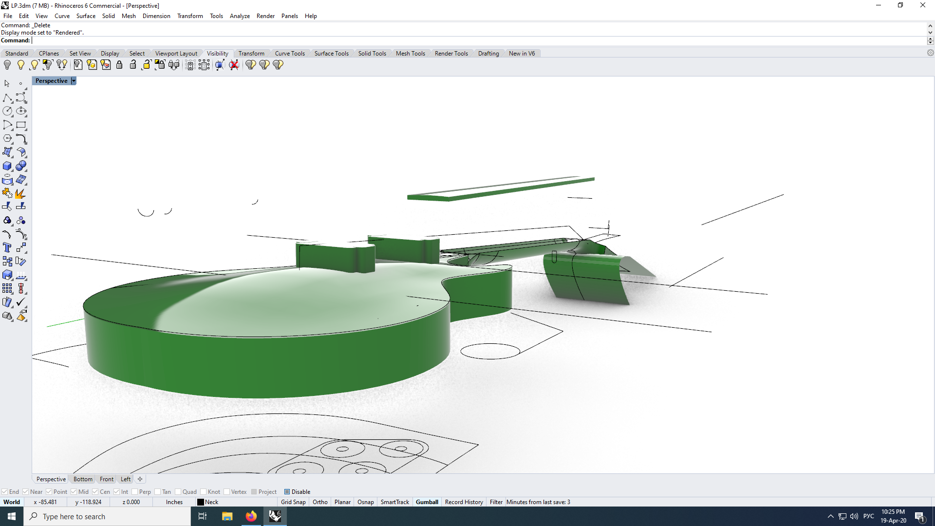 Некоторое время назад загорелся темой повторения этой легендарной гитарки, и после неудачи с "дедовским методом" (форма из фанеры, шпатлевка, шкурки и пыль-пыль-пыль, а в итоге её, эту форму повело и крутануло, ага) подумал "а отчего бы не сделать всё с применением высоких технологий? Скачал Блендер, давно хотел его попробовать, но всегда удалял после открытия, а тут новая версия подоспела. Более-менее въехал в его интерфейс, смоделировал "первый блин", результат не понравился. Думал, что дело в шейдинге, и модель нормальная сама по себе, просто коряво отображается. Экспортировал в 3DS (не хотел его ставить, много весит, да и скурвился автостол, раньше в нем моделил всякое по работе), там та же картина - просто сетку вменяемую в областях рогов сделать не удалось. Переделал. И вдруг захотелось соответствия, чтобы всё по изолиниям чертежа, точно! Вот ещё и Рино теперь... А ты говоришь про Fusion, лол!