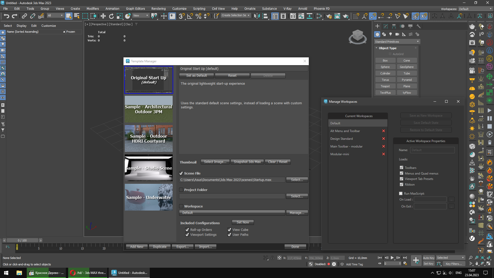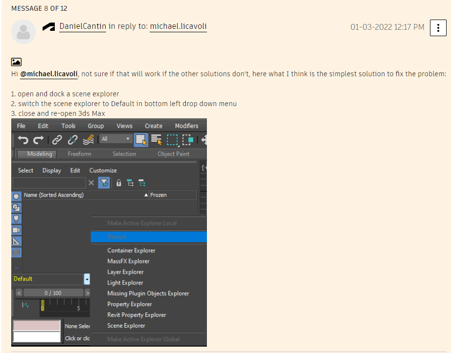 Привет кабанчики. Подскажите как сделать так, чтобы при запуске 3dsMax аутлайнер (scene explorer) открывался автоматически, всегда был открыт по дефолту, а сейчас при запуске надо вручную открывать. Бесит. Пробовал в template manager сохранять файл сцены с открытым эксплорером и в manage workspace сохранять. Хз чё делать. P.S. блендер не предлагать, параша ещё та)