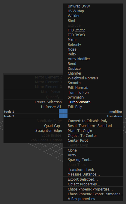 >>342286 3д максом "из коробки" невозможно нормально пользоваться, нужен предварительный пердолинг с установкой скриптов и плагинов. Я эти функции с ресет трансформ и пивот в центр вынес в квад меню, туда же закинул важные модификаторы.