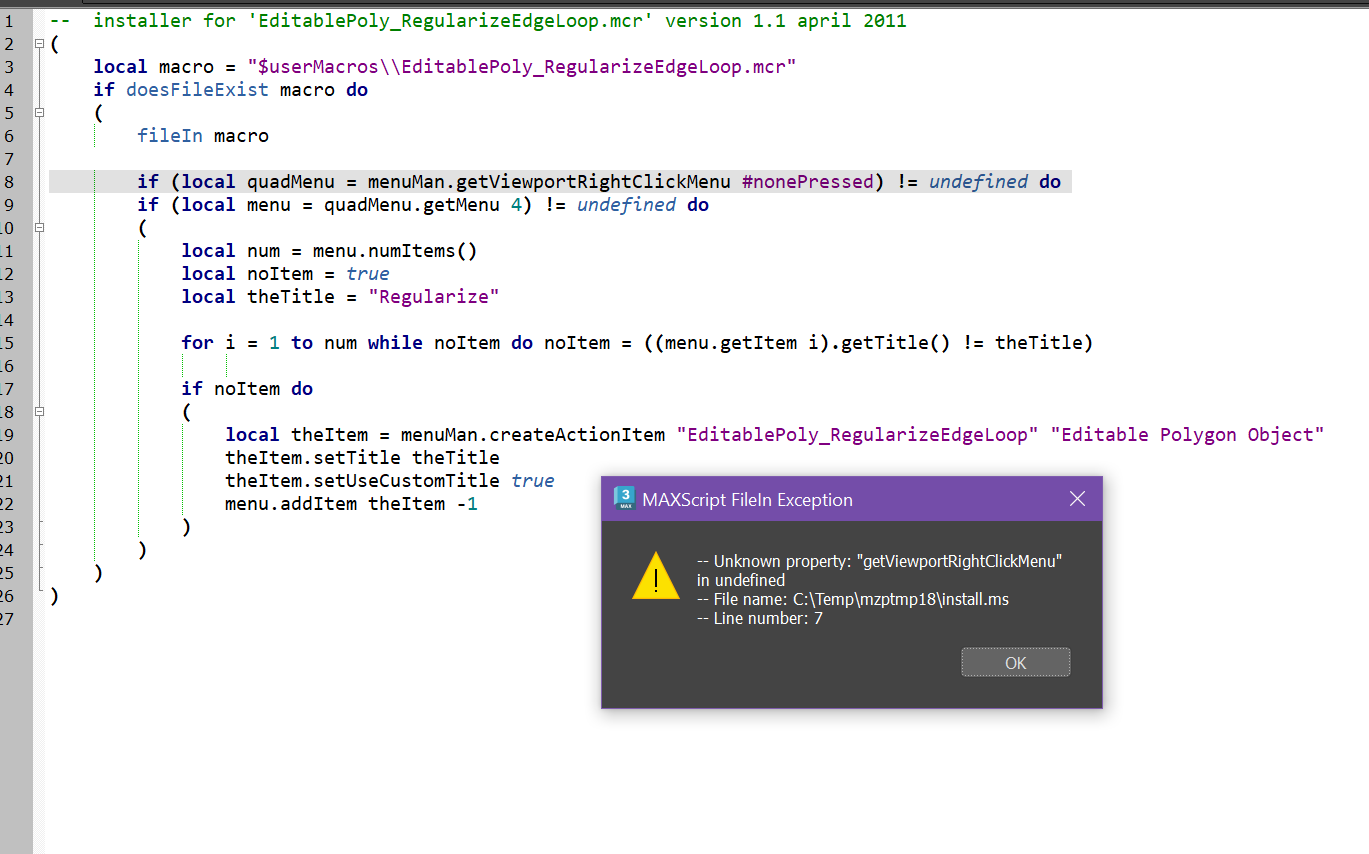 Но теперь появился новый вопрос :) Смотрите: Есть такой скрипт "Loop Regularizer" или его новая версия "Edge Loop Regularizer" - они из выбранных вершин/граней/полигонов делают окружность. Вот ссылки на них: https://www.scriptspot.com/3ds-max/scripts/loop-regularizer https://www.scriptspot.com/3ds-max/scripts/edge-loop-regularizer-editpoly Так вот, во-первых, ни один из них не работает в 25 максе. Во-вторых, ни один из них не видит soft selection. А вопрос такой - есть ли какая нибудь альтернатива? В идеале чтобы работали в свежем максе. Но хотя бы чтобы soft selection чувствовали, или может быть были настройки хоть какие нибудь?