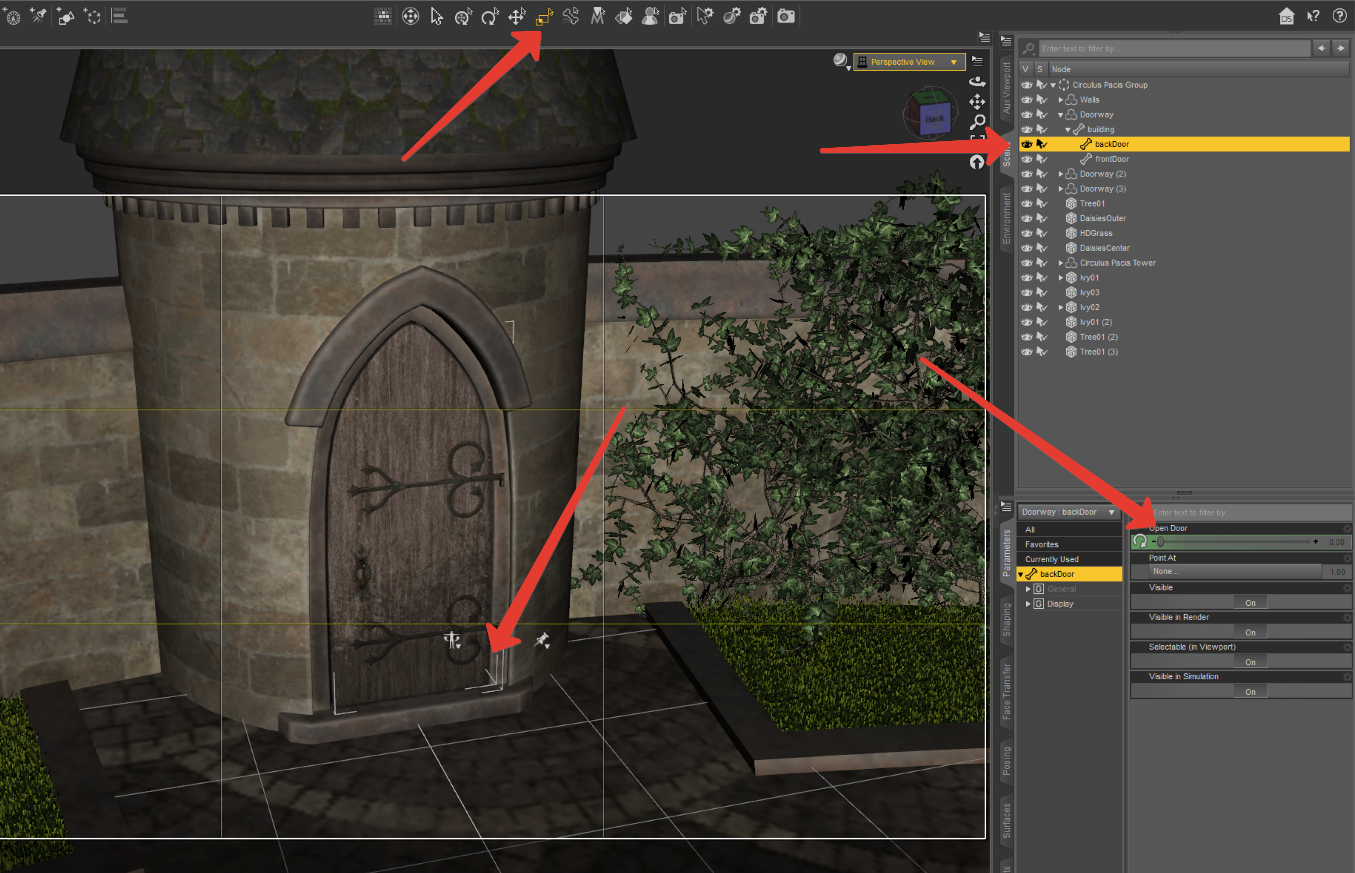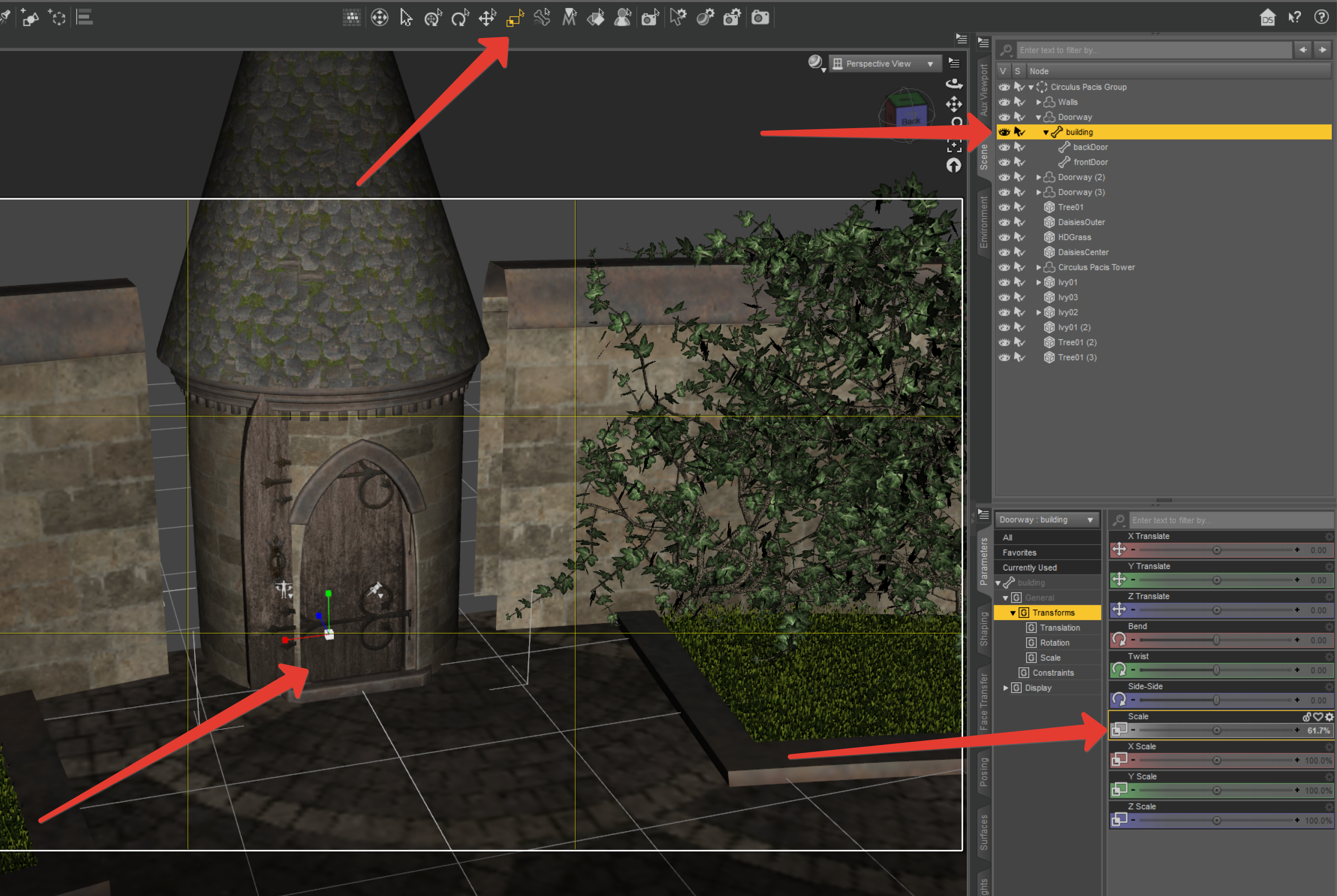Ещё такой тупой вопрос от новичка: Есть объект, на примере этой башни. Её можно скейлить туда-сюда, как на скрине 1. Но дверь нельзя, что видно на скрине 2. Ни инструментом невозможно, нет XYZ полхунков. Ни параметра нет, только открыть/закрыть. Что можно сделать в ДАЗе, чтоб можно двери насильно скейлить? Другой софт не предлагать.