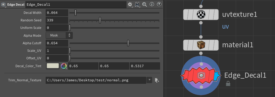 Пацаны я почти доделал тул который полностью автоматизирует создание эдж декалей. Выложу скоро сюда. Короче самый трюк внутри, это нода ювилэйаут, которая использует таргет правило раскладывание ювишелов в зависимости от подаваемого на второй вход текстуры атласа с декалями накинутой на заранее разрезанный плэйн. Просто подаёшь трим и всё. Сам атлас сделал с помощью лабсовой эдж дэмэдж, просто запёк с кубов и раскидал в атлас. Опасити текстура создаётся процедурно через коп контекст из входящей текстуры нормалей, там происходит всякий разблюр краёв.