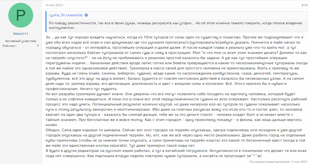 >>299351 >>299281 >>299264 Вы не совсем правы. Вы говорите о гудини специаласте, который делает простые задачи или повторяет туториалы. А вот чтобы над серьезными вещами работать - там уже реально надо тип мышления технический.