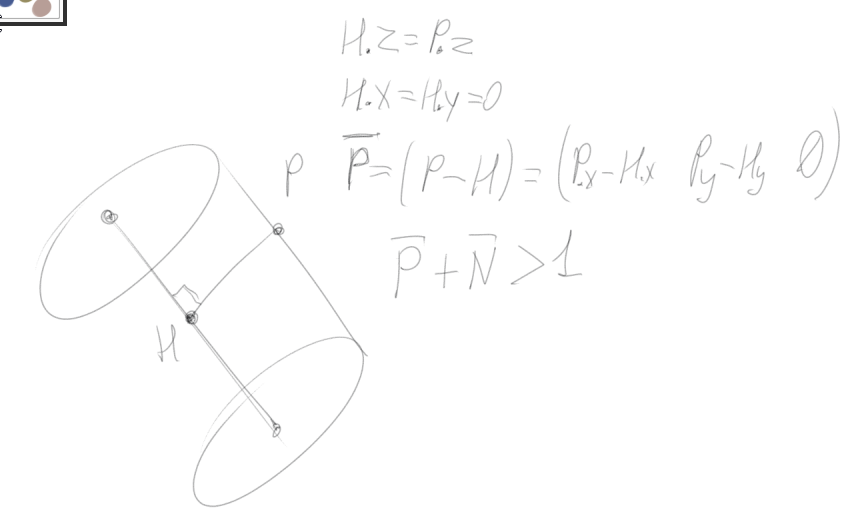 >>301601 P и H кординаты точек (ну или вектора от начала кординат). С надчёркиванием — вектора от точки до точки, направление от оси в точку и нормали. Если их направления совпали, знач нормаль смотрит наружу.
