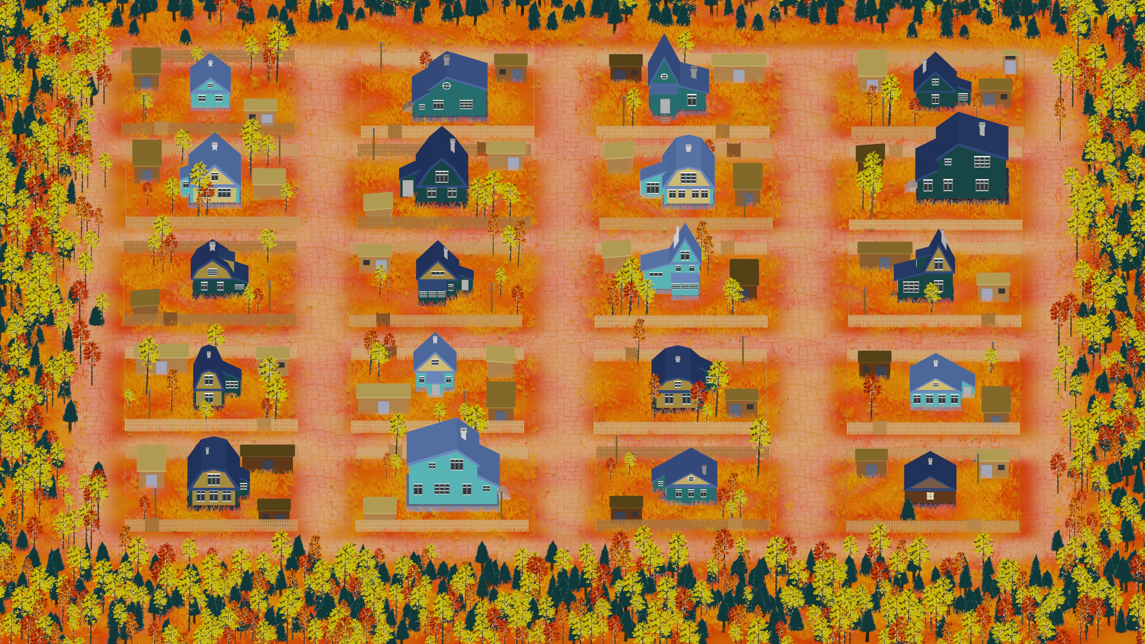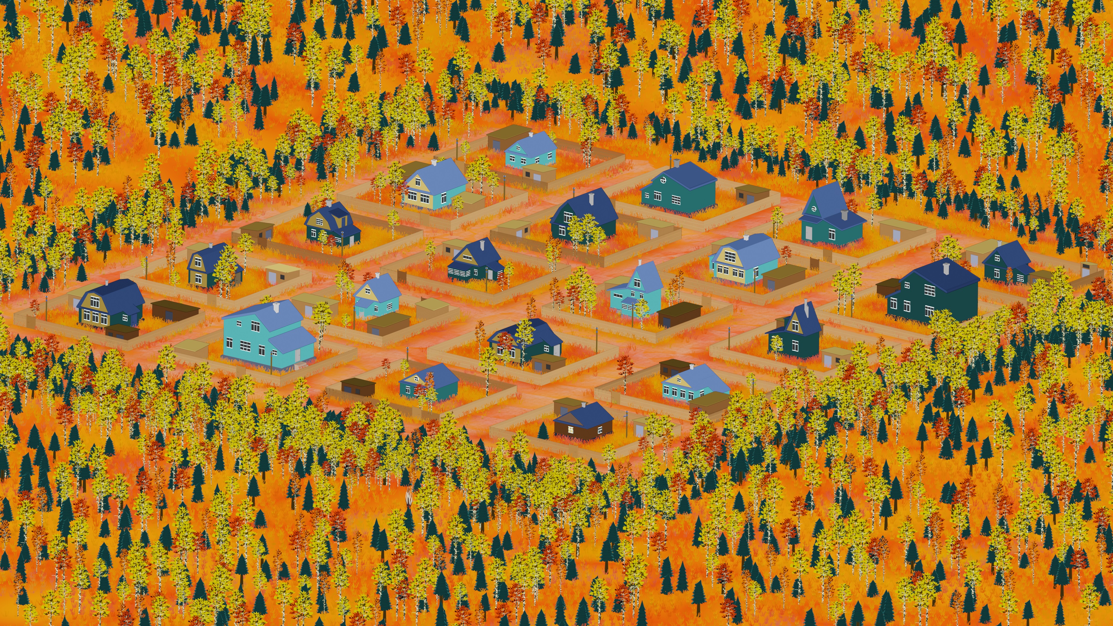 Изометрия решает. Только как то странно выглядит, если это игра я бы понял, чего не бывает. Тут же анимация, мульт? Где там дорога разебанная подъездная, железка вдалеке, сгоревшая хата местного алкаша, где в конце концов сартиры с сердечками и т.д.? Короче ЖИЗНИ надо добавить.