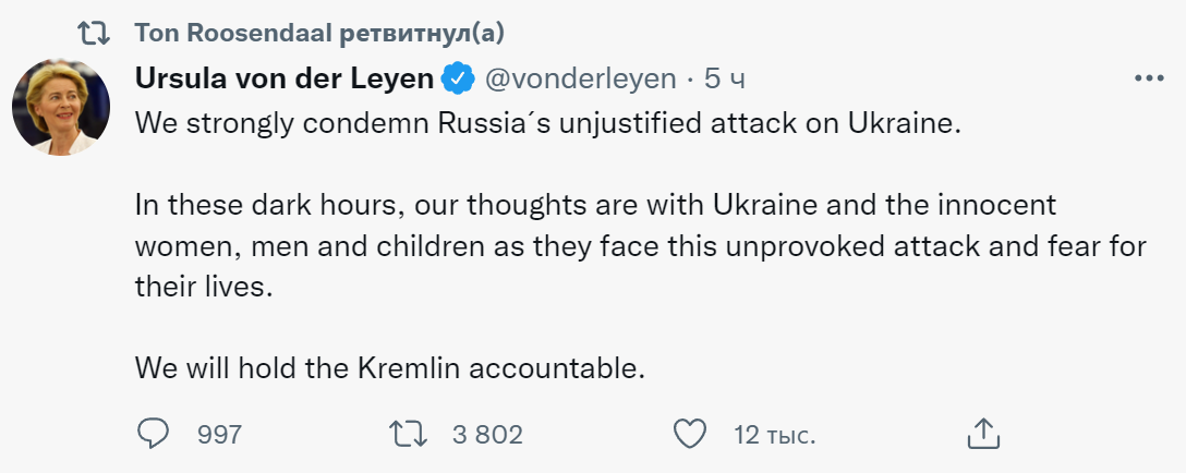 Этот незаконный и кровавый акт в самом сердце Европы угрожает миру всех людей в мире. Разрушительные последствия для жизни миллионов украинцев разбивают нам сердца. Президент Путин и его клика должны быть остановлены. Мы можем только надеяться, что подавляющее большинство добросовестных россиян сами найдут мирный выход из этого кризиса.