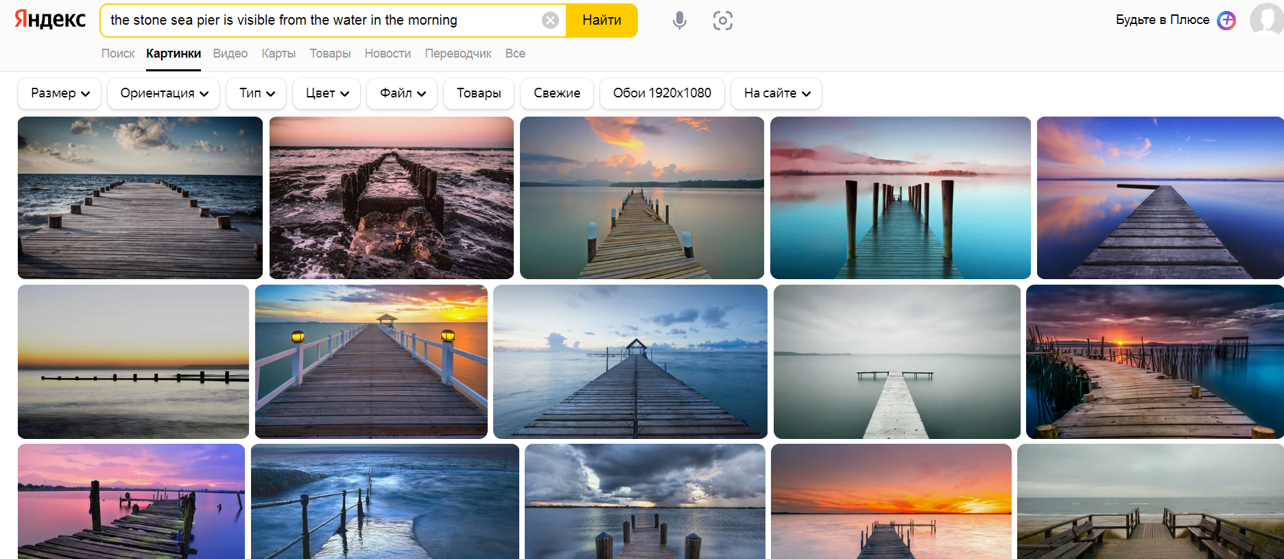 Корч нашел нейросеть, которая шакальные результаты выдает, но фишка в том что её можно в совокупности с поисковиком юзать: >the stone sea pier is visible from the water in the morning По такому дотошному запросу естественно поисковик выдаст тебя хуйню. Но если загнать в нейросеть, эту бомжовскую https://www.craiyon.com/ выбрать варик который тебе подходит (на пике всего 1н, потому что назад не возвращает), и жмякнуть поиск по картинке, поиск получится адекватней. Еще можно вбивать с припиской >on white background И на изичах в фотошопе вырезать с фона, и создавать lazy shapes, ландан ис зе кепитал оф греат британ.