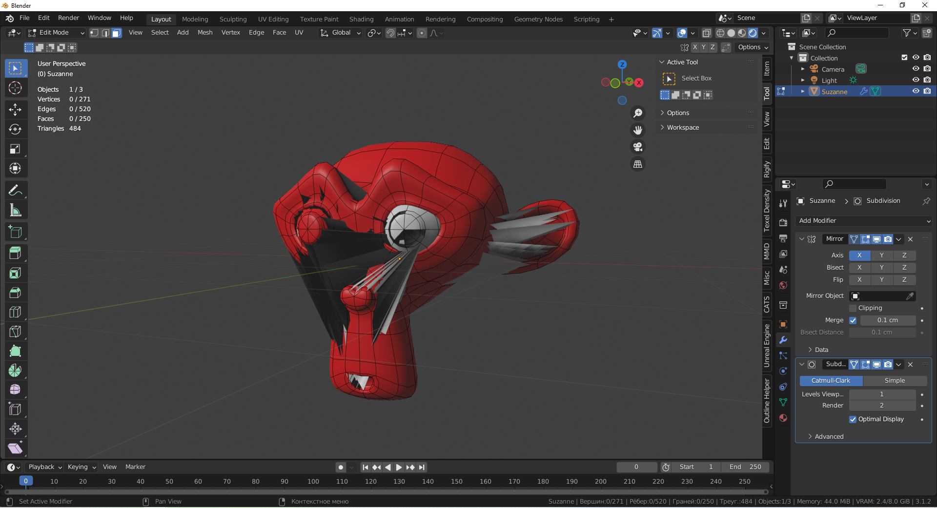 3.1.2 Под модификаторами зеркала и сабдива, если на меше (например, на Сюзанне) больше одного материала, то в режиме редактирования её случайным образом пячит. На 2.8 такого не было. Проверьте кто-нить у себя, это баг или мой комп мудрит?