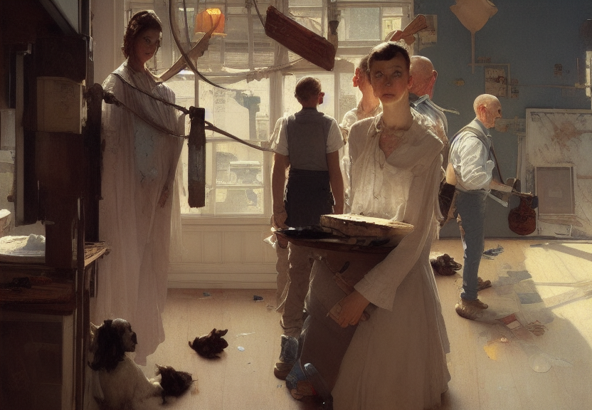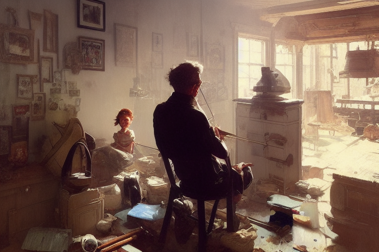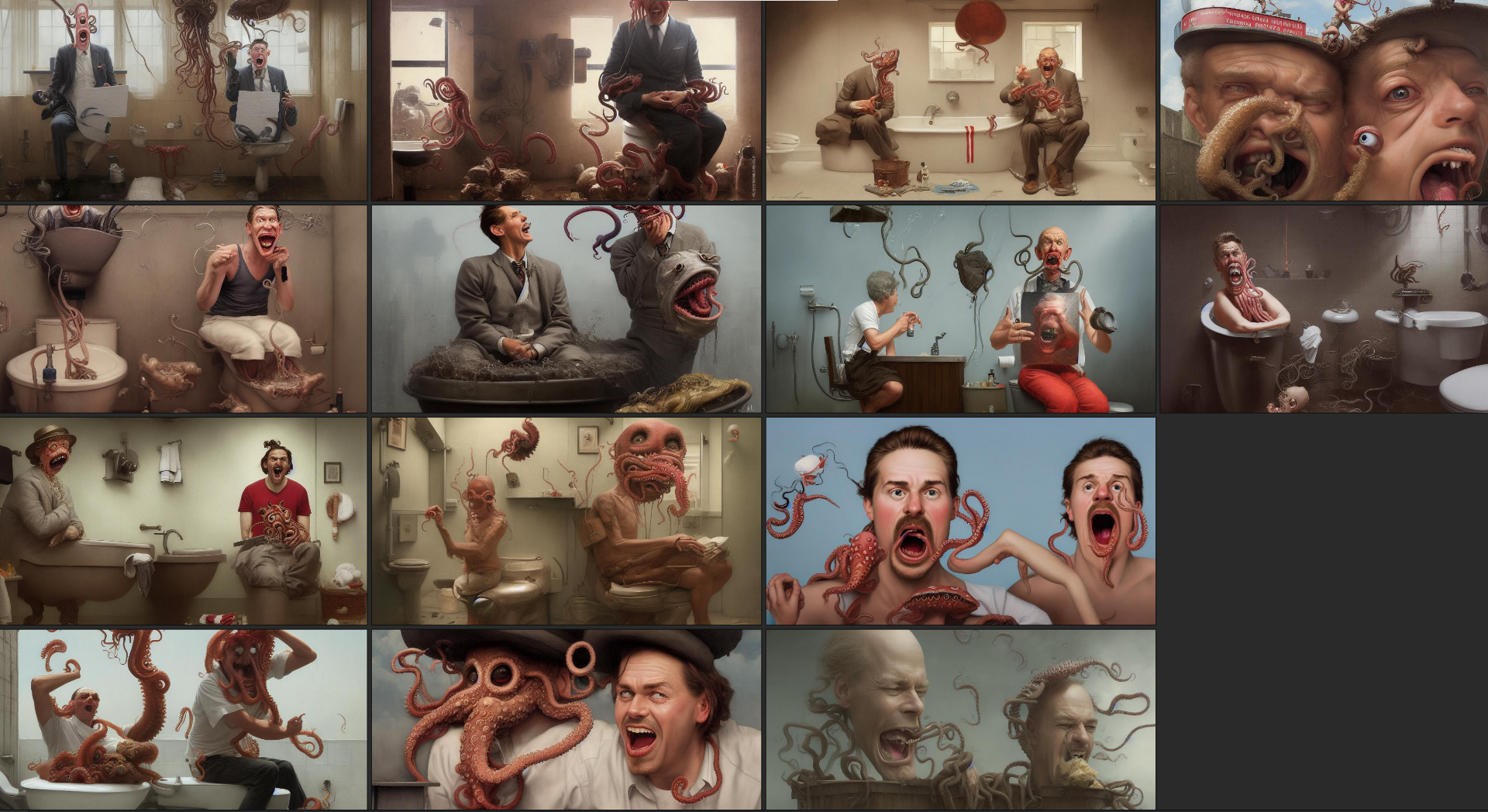 Бля, какая же крипота выходит, когда нейронке даёшь свободу, не указывая запрос, а просто вбиваешь имя художника и она пытается в какую то "осмысленность" композиции.