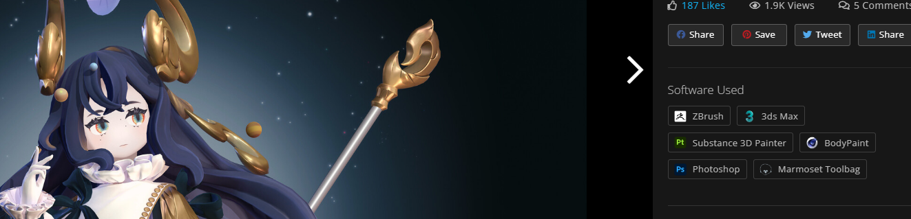 >>305399 Зебра для скульптинга Макс для топологии Сабстенс для материалов Бодипеинт для юви. Фотошоп для коррекции текстурок и композинга рендеров. Мармосет для установки на столик и рендера всего вышесказанного.