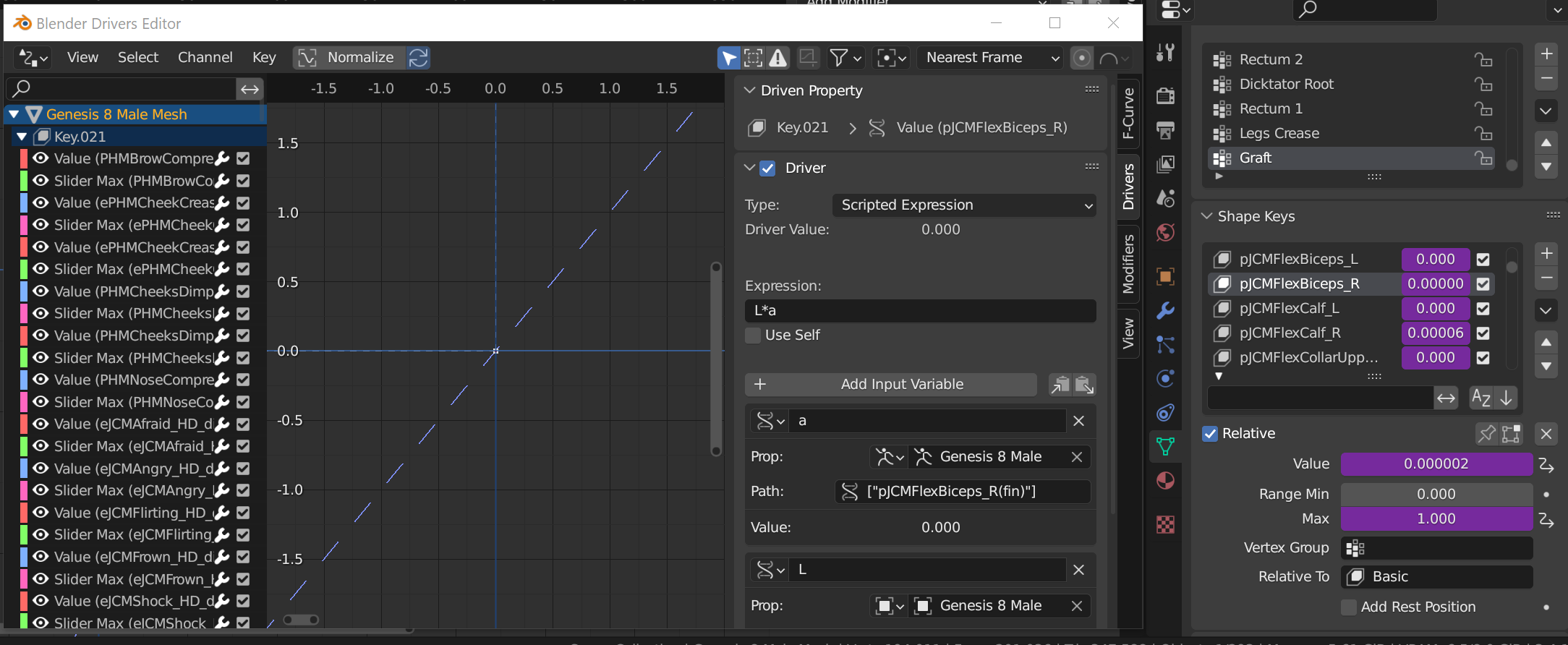 >Import JCM Так падажити это же joint controlled morph они все в ДАЗе контролируются через "иерархию формул" т.е. у одного параметра есть "формула" которая контролирует другой. Это может быть умножение, линейная зависимоть, график с кривой и точками. Сложная формула из нескольких действий. Есть ветвление, т.е. один параметр может контролировать сколько угодно других параметров таким образом. Это что тоже всё переносится ? Как формулы реализованы в блендере? Тогда получается даз вообще на хуй не нужо'н?