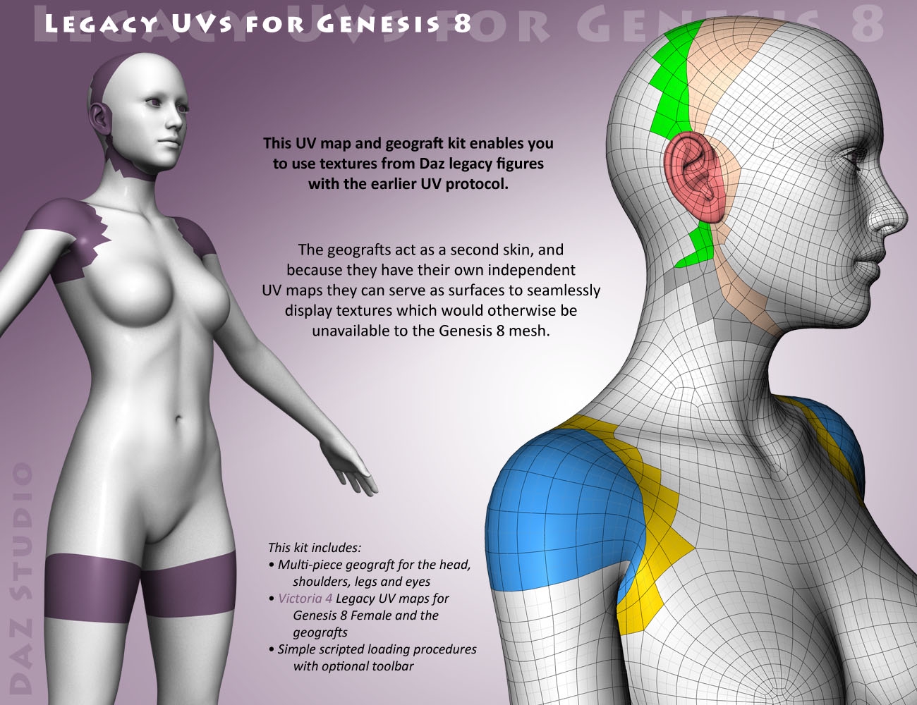 Есть ли в природе конвертер текстур из V4 в G8, UV или какой-нибудь волшебный способ натянуть текстуры от V4 на G8. На пике единственный ДАЗовский продукт, который это делает. Но он не работает без геошелов, которые закрывают дырки в UV это не подходит, нужно что-то без вспомогательной геометрии.